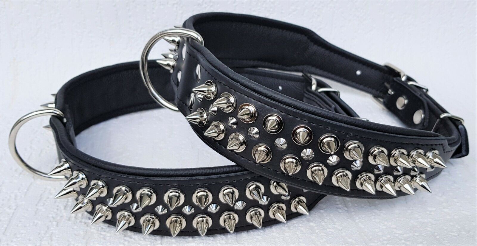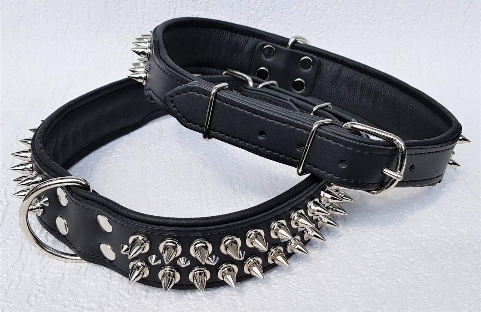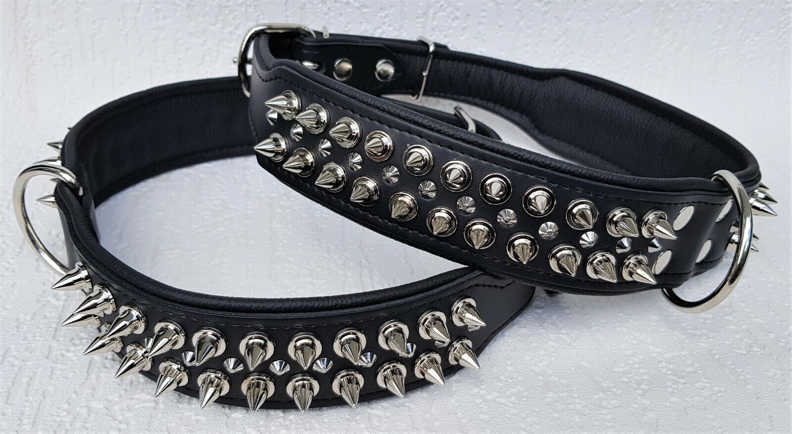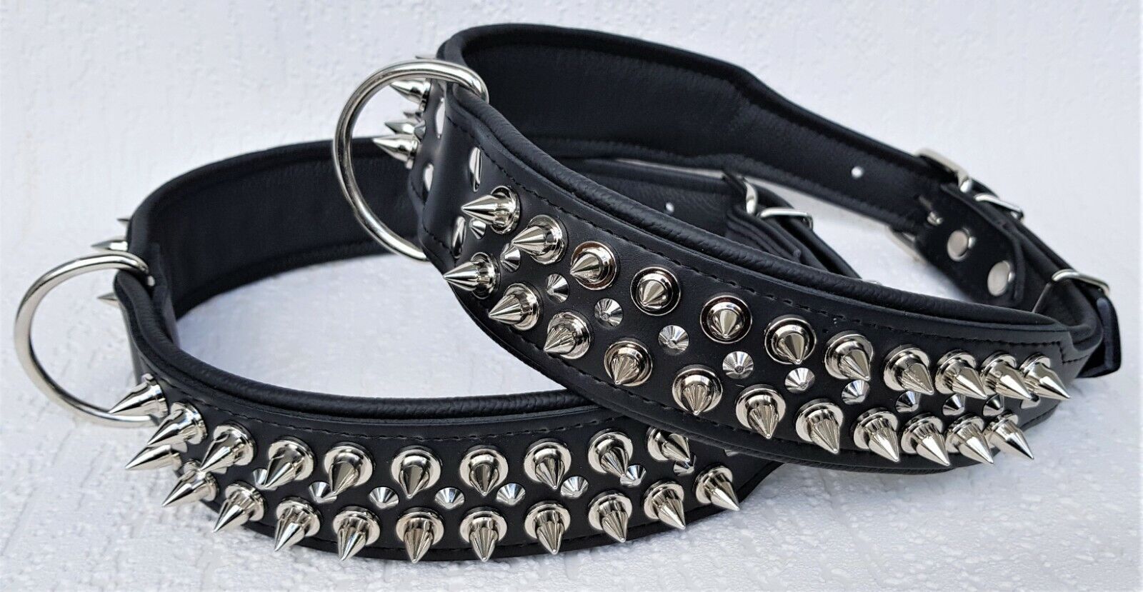 Lederhalsband mit STACHELN Maße: Gesamtlänge : 80 cm Halsumfang : 62 - 73 cm Breit : 50 mm Messen Sie hierzu bitte den Hals ihres Hundes. Material : - 100 % hochwertiges Leder, sehr robust - Schwarz verziert mit runden Stacheln - gefüttert mit Leder Bitte beachten Sie auch andere Angebote!