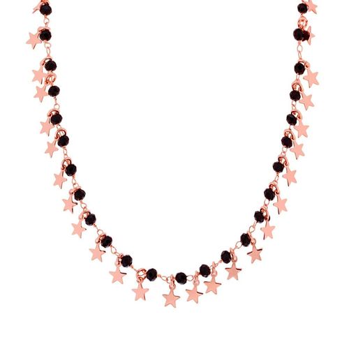 Halskette mit Perlen aus schwarzem Kristall und Anhängern in Form von Stella plain, mit glatter, glänzender Oberfläche.