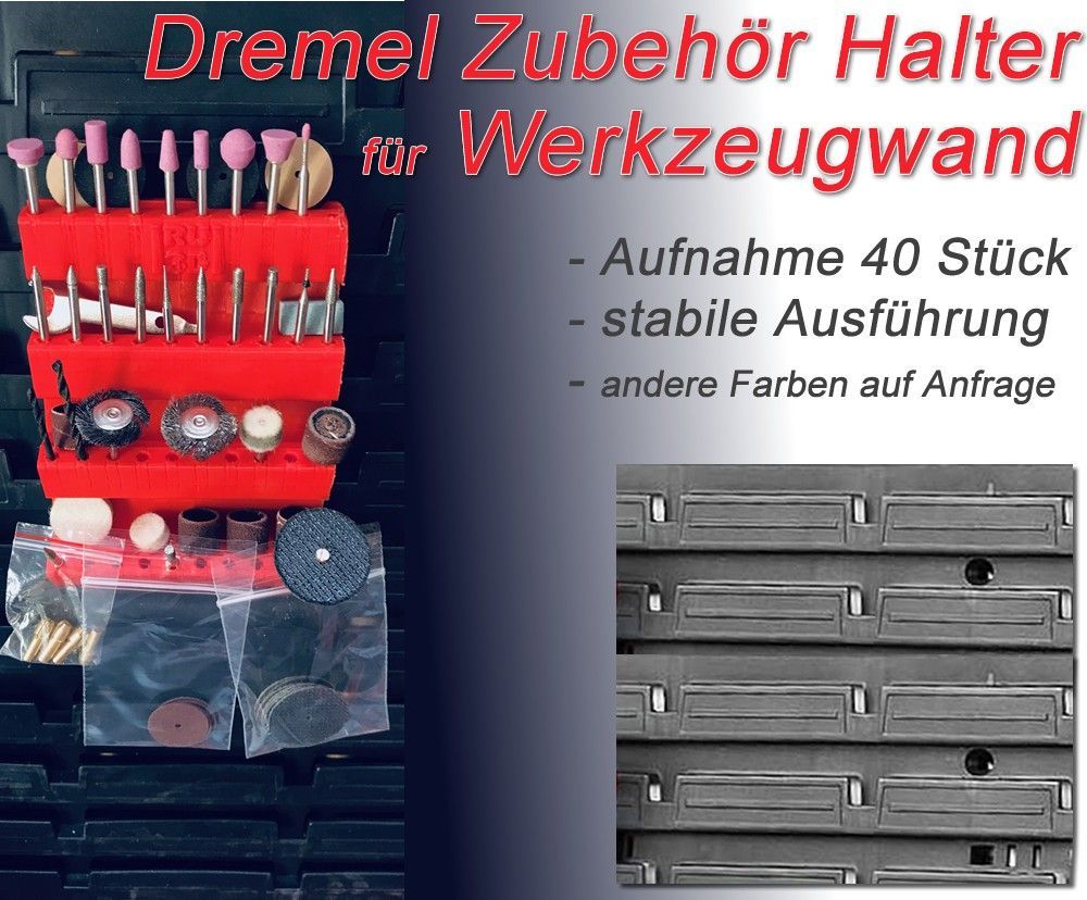 Werkzeughalter passend für Dremel Set an Werkzeugwand Erweiterung für Werkzeugleiste in rot Beschreibung Geeignet für Wandplatten mit Halterungsschienen (Pafen, ITBN, Botle) Aufnahme für 40 Stück Dremel o.a. Werkzeuge. Stabile Ausführung. Die Haltervorrichtung ist deutlich steifer, dicker, fester un