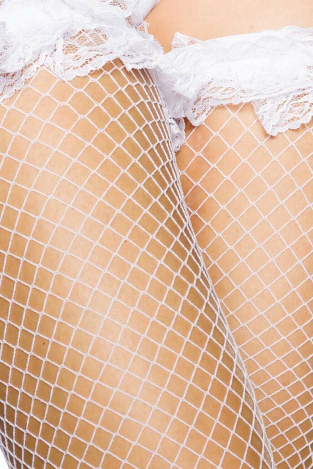 Halterlose Netzstrümpfe Weiß mit Rüsche Gr. XS - L