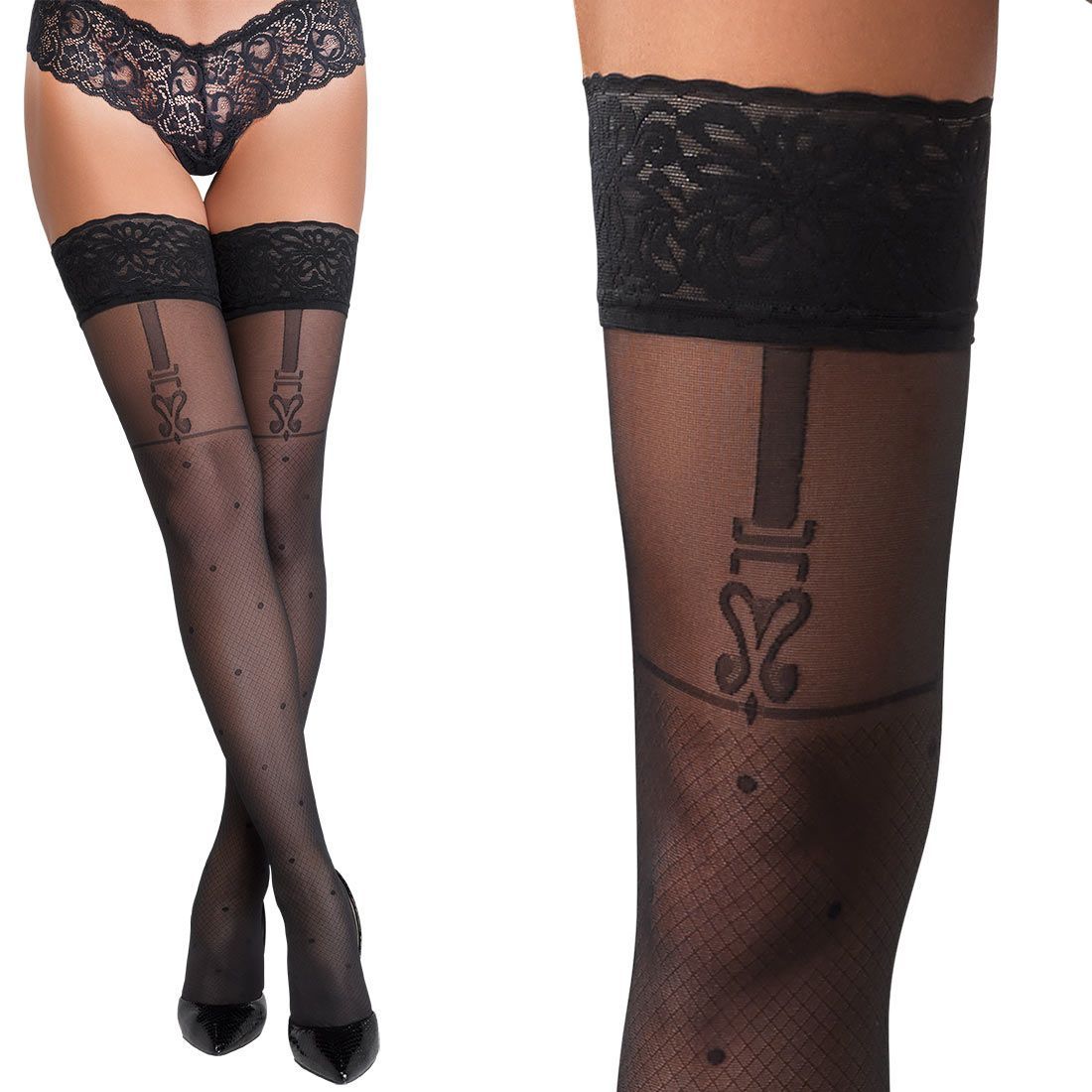Halterlose Strümpfe 40 DEN S-XL breite Spitze Straps + Netz Muster sexy "Flirt"