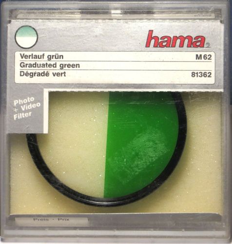 Hama Filter Verlauf Grün Graduated green Degrade vert M62 Wurde auch bei Ebay-Kleinanzeige eingestellt ( 1918787564 ) Effektfilter Trickfilter fotografische Filter Filtergröße M 62 - Ø 62 mm Einschraubgewinde Der Filter ist neuwertig und ohne Mangel, das Gehäuse hat stärkere Lagerspuren Nicht