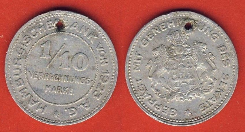 Hamburg - 1 10 Verrechnungsmarke - Hamburgische Bank von 1923 A.G. lesen Münze defekt. Siehe Bild Beschreibe meine Angebote nach besten Wissen und Gewissen. Der Artikel wird wie beschrieben von Privat verkauft, daher schließe ich eine Gewährleistung Garantie nach den geltenden EU Gewährleistungsrich