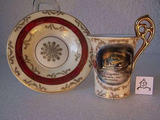Angebot : Handbemalte Mokkatasse, Geb. Schönau - Porzellanmanufaktur in Hüttensteinach. Porzellanmarke ab 1900 bis 1920 - s. Foto , Extrazettel. Zentralbild, das Feengrotten b. Saalfeld i. Thür. Märchendom zeigt , ist handgemalt. Hintere Seite von der Tasse ist mit den gleichem Ornament wie die Unte