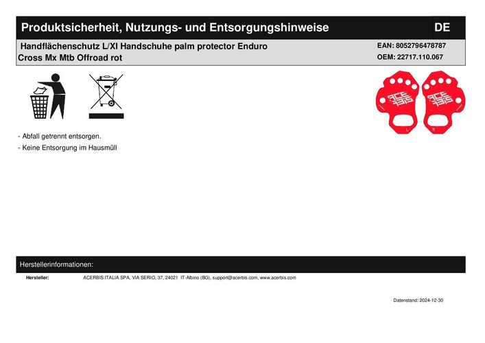 Acerbis Handflächenschutz L/Xl Handschuhe palm protector Enduro Cross Mx Mtb Offroad rot