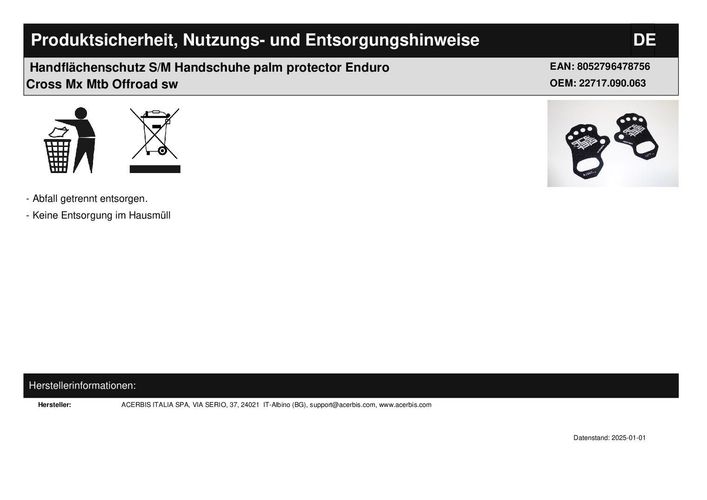 Acerbis Handflächenschutz S/M Handschuhe palm protector Enduro Cross Mx Mtb Offroad sw