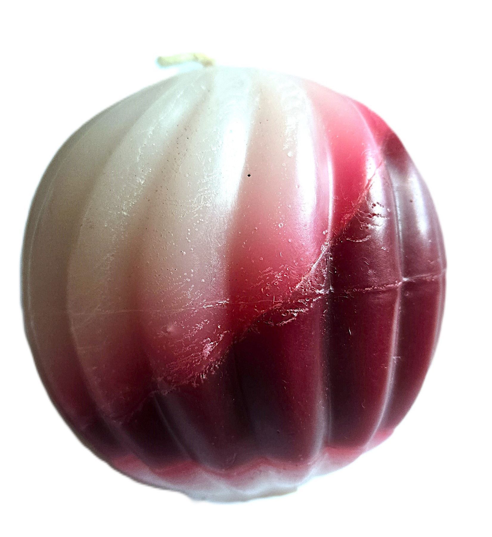 > handgefertigte weiße Kugelkerze mit bordeauxfarbigen Kontrasten > Kerze ca. 7 cm Durchmesser > Kugel in geriffelter Form > Unikat