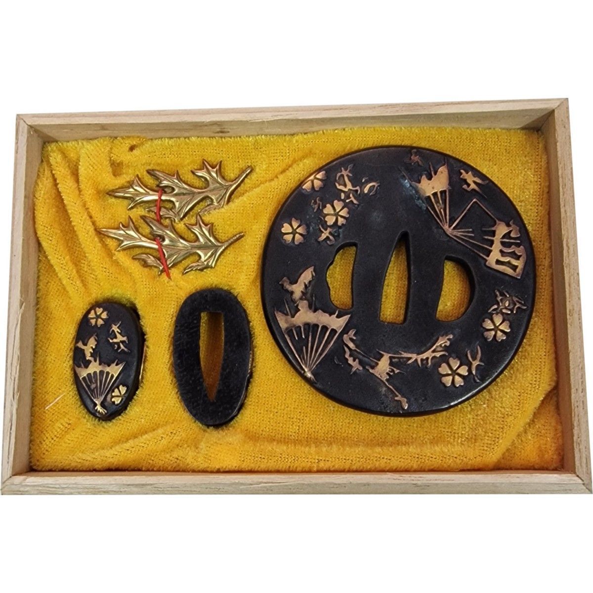 Hanwei Handgefertigtes 5er Samurai Set, Fächer Tsuba, Fuchi, Kashira, 2x Distel Menuki
