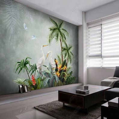 • Fototapete Blätter - Tropische Pflanzen & Vögel Handgemalt Wandbild 10466