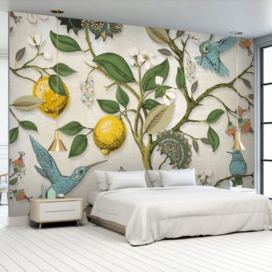 • Vlies Fototapete Wandtapete Wandbilder Handgemalte Blumen Vögel Blätter 11182