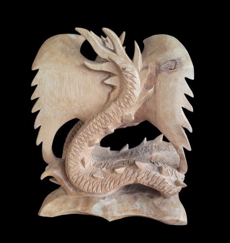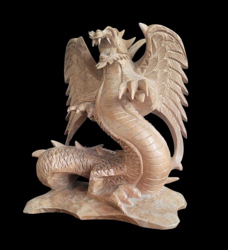 Zum Verkauf steht eine aufwendig handgeschnitzte Drachenfigur, vermutlich aus Bali. Die Figur ist massiv gearbeitet, sehr detailreich und wirkt insgesamt kraftvoll und präsent – ein echtes dekoratives Einzelstück. Vollplastisch gearbeitet, rundum geschnitzt. Der Zustand ist insgesamt sehr gut.