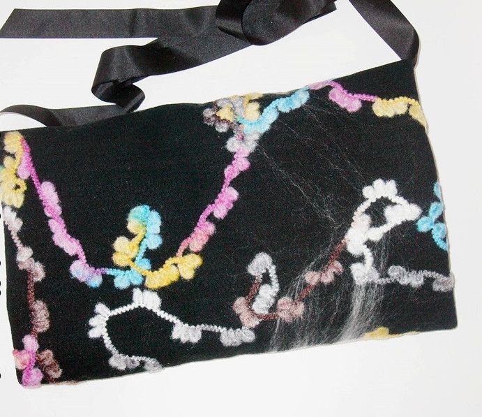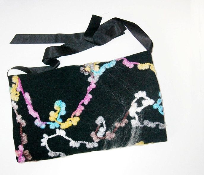 Muff aus Walkstoff mit Filz Ornamenten. Die Umhängeschnur kann individuell zusammen gebunden werden. Der Muff kann nach belieben auch gewendet werden. Ca. 30 cm breit ca. 42 cm Umfang Aussenstoff 80 % WV, 20 % CO Futter 100% Polyester Jeder Muff wurde von mir nach eigenem Entwurf selber hergestellt.