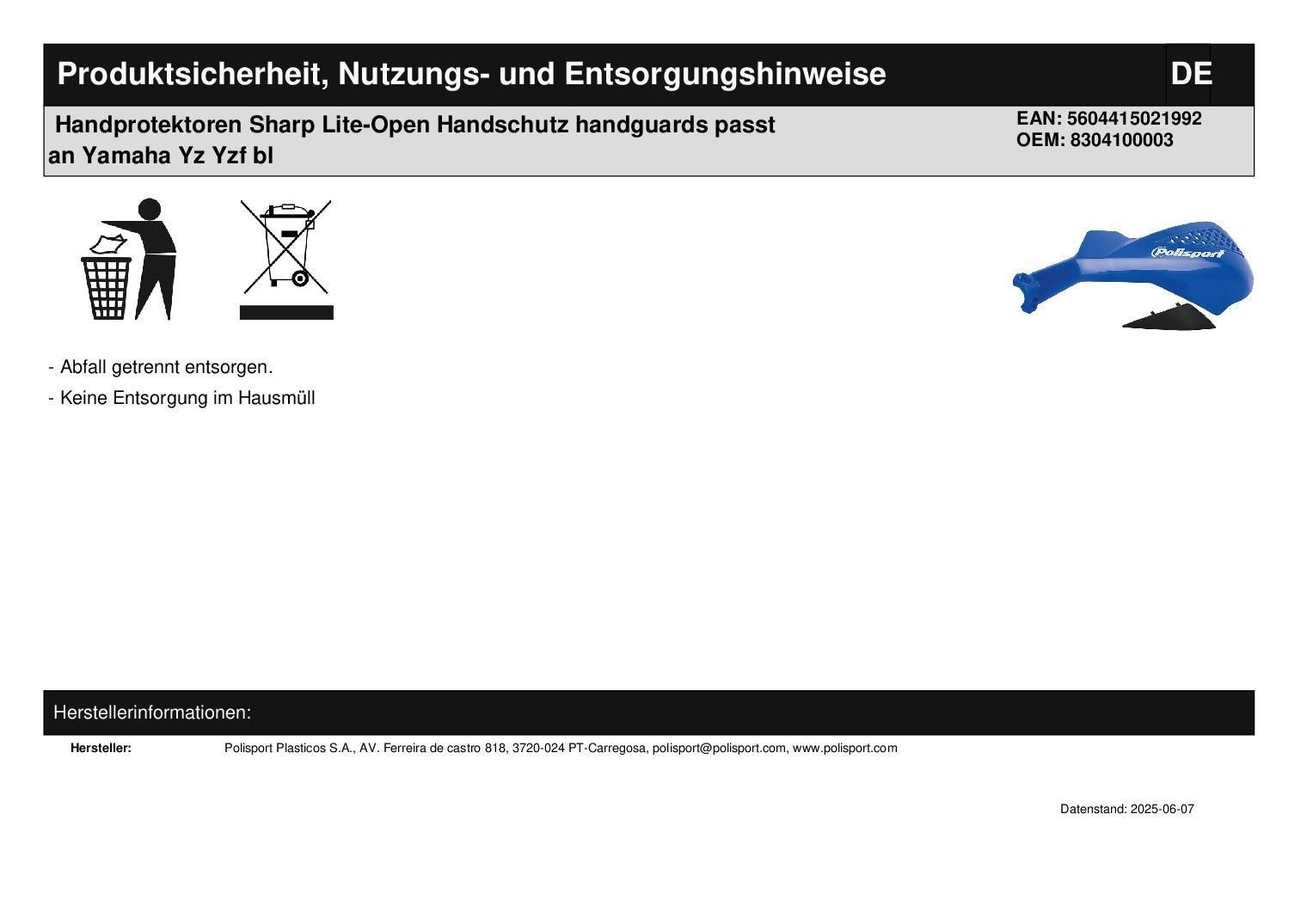 Polisport Handprotektoren Sharp Lite-Open Handschutz handguards passt an Yamaha Yz Yzf bl