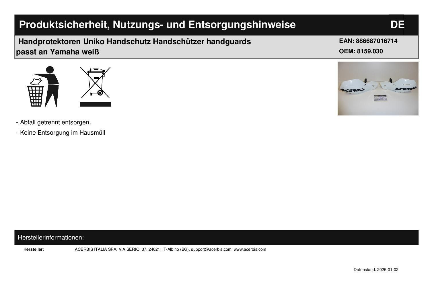 Acerbis Handprotektoren Uniko Handschutz Handschützer handguards passt an Yamaha weiß