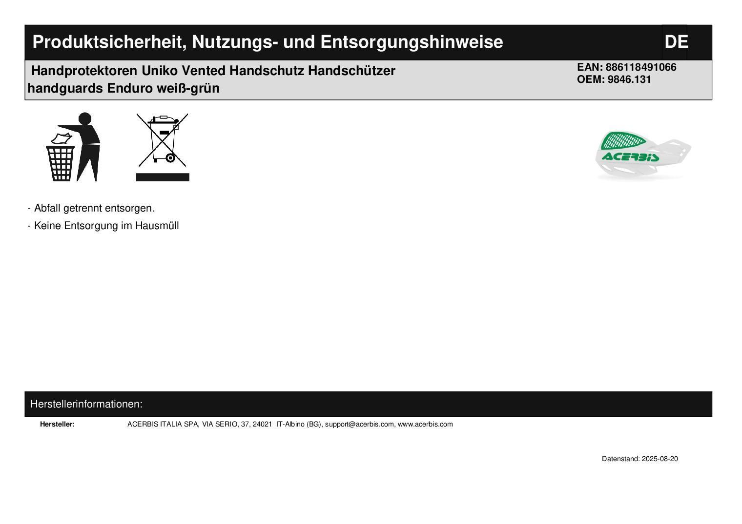 Acerbis Handprotektoren Uniko Vented Handschutz Handschützer handguards Enduro weiß-grün