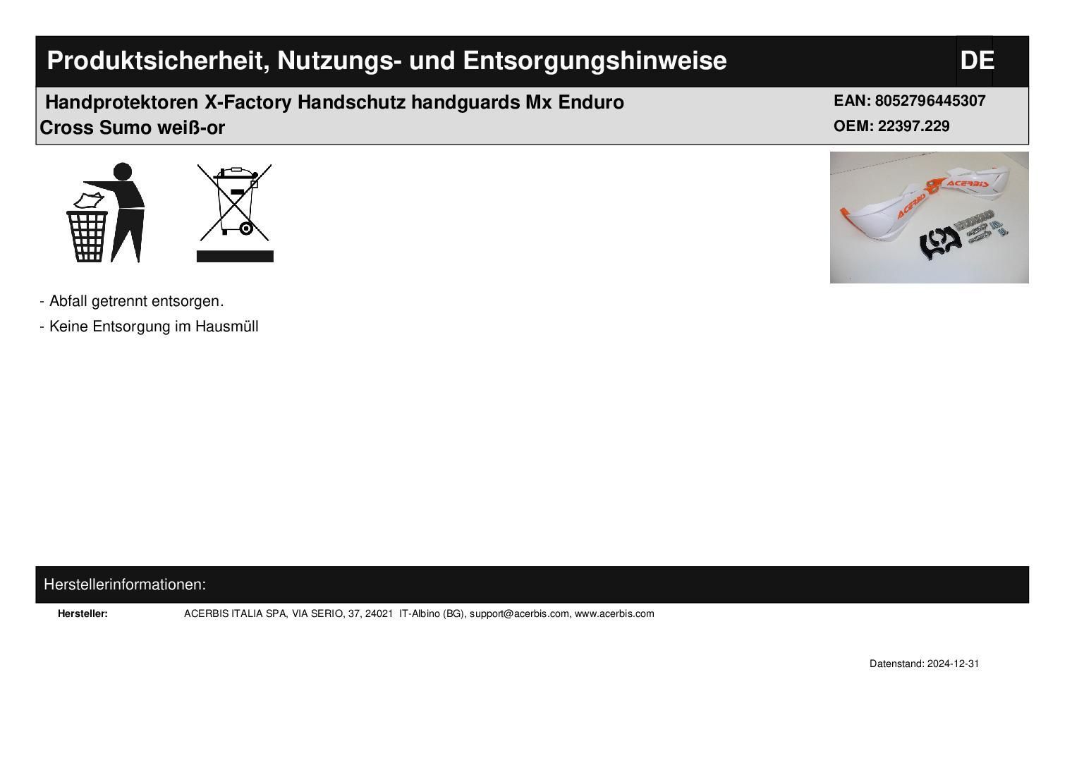 Acerbis Handprotektoren X-Factory Handschutz handguards Mx Enduro Cross Sumo weiß-or