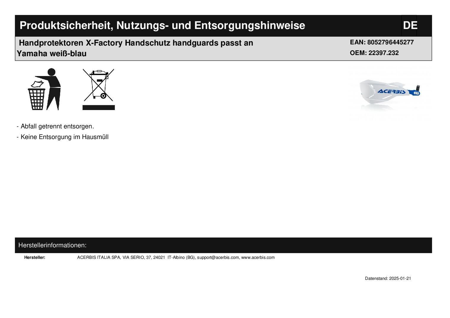 Acerbis Handprotektoren X-Factory Handschutz handguards passt an Yamaha weiß-blau