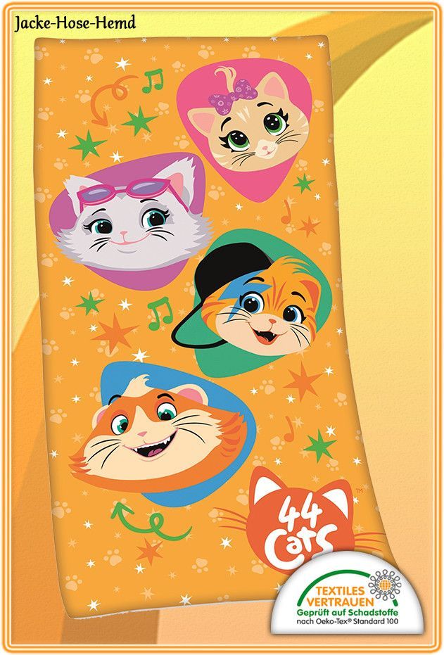 Handtuch 44 Cats Lampo Milday Pilou Poppetta Katze Produktbeschreibung: Badestola 44 Cats , Lampo, Milday, Pilou und Poppetta , Größe: 75x150 cm Das Bild zeigt ein farbenfrohes Kinderbadetuch mit Motiven aus der beliebten Zeichentrickserie „44 Cats“ . Der Hintergrund ist orange und mit Pfotenabdrück