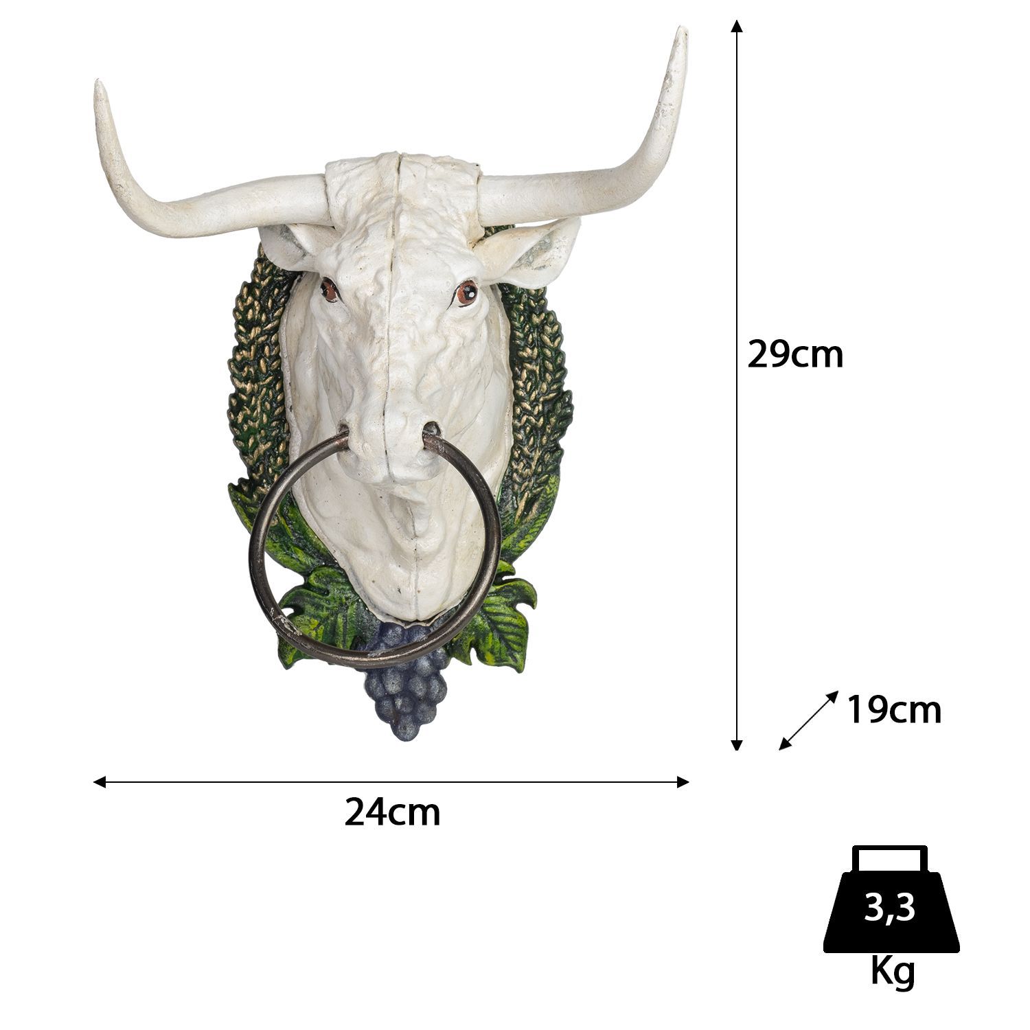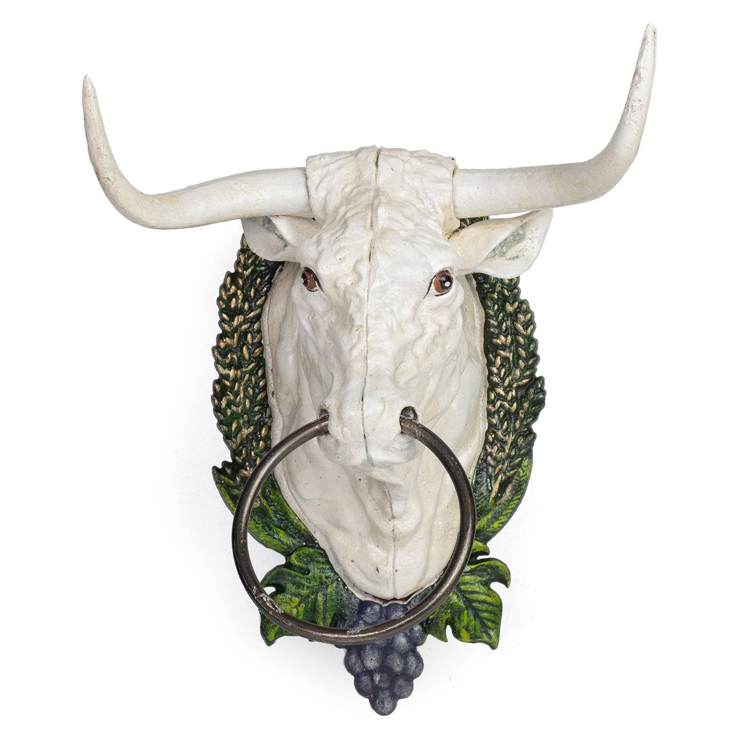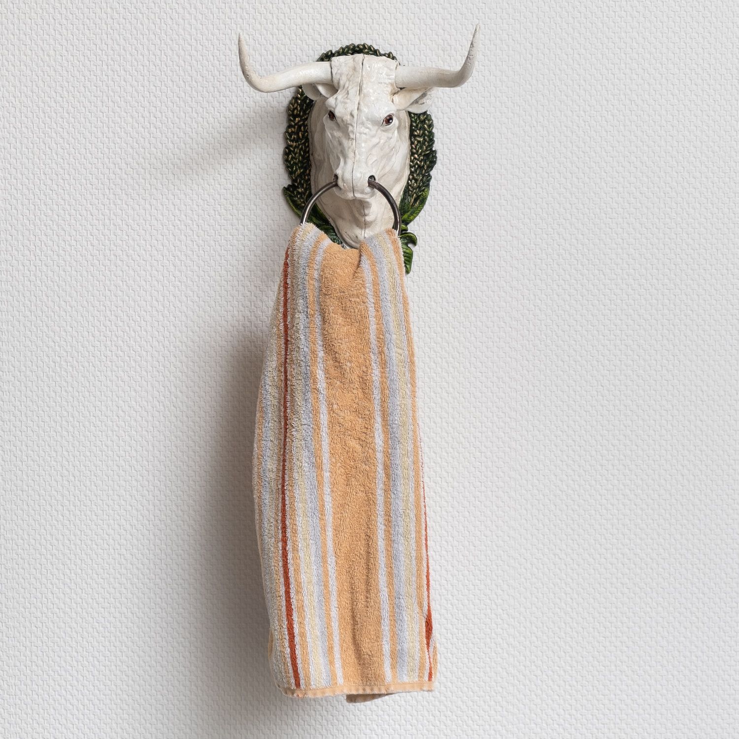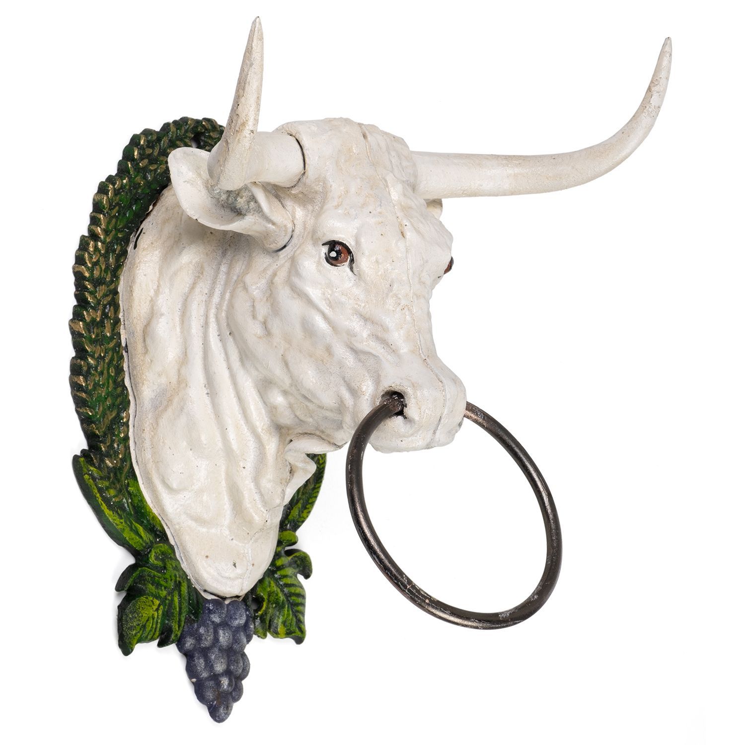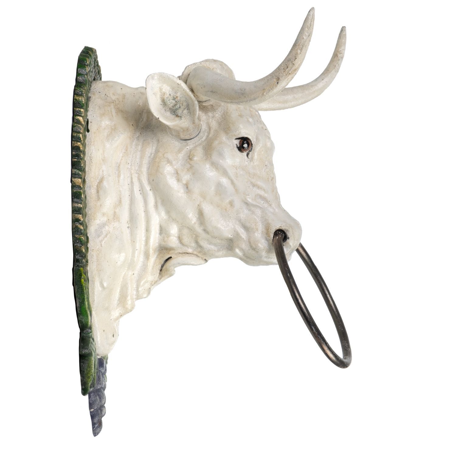 Handtuchhalter Stierkopf Gusseisen Wandhalterung Kuhkopf mit Ring Weiß Antik Design 2