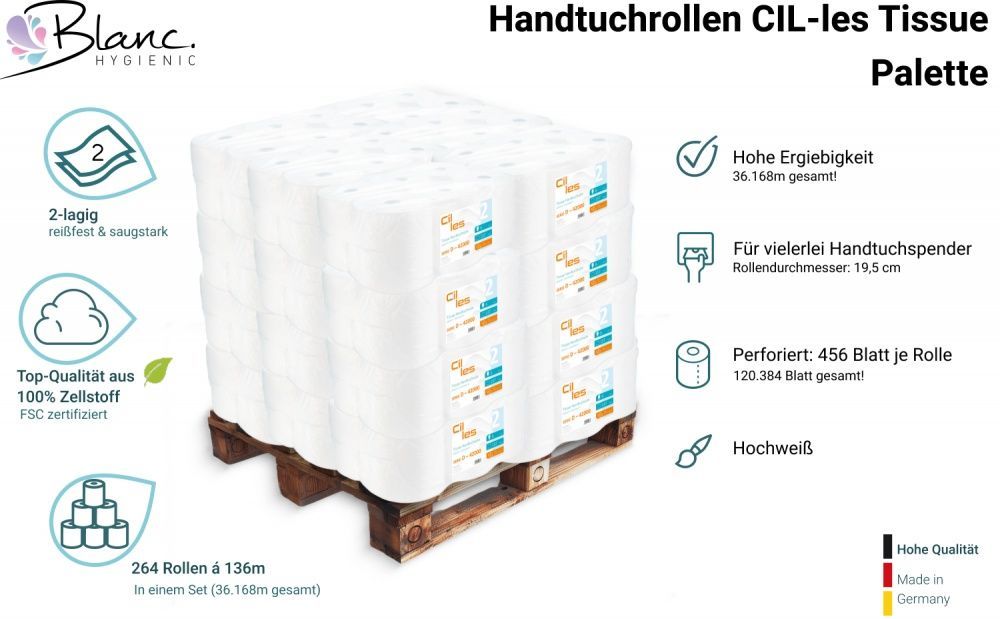 Handtuchrollen, 2-lagig, 264 Rollen, 36168m gesamt, 137m je Rolle, 100% Zellstoff, CI