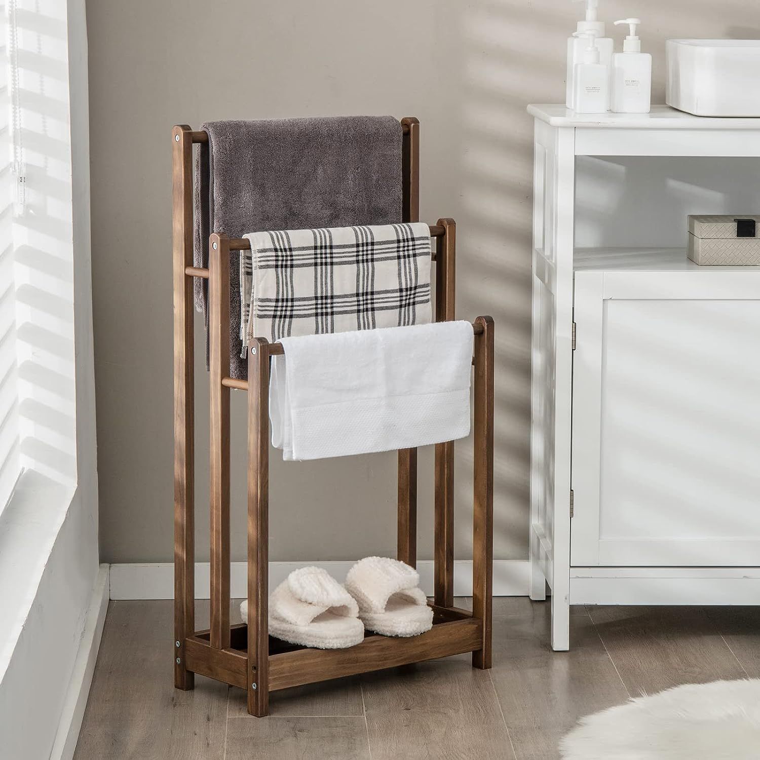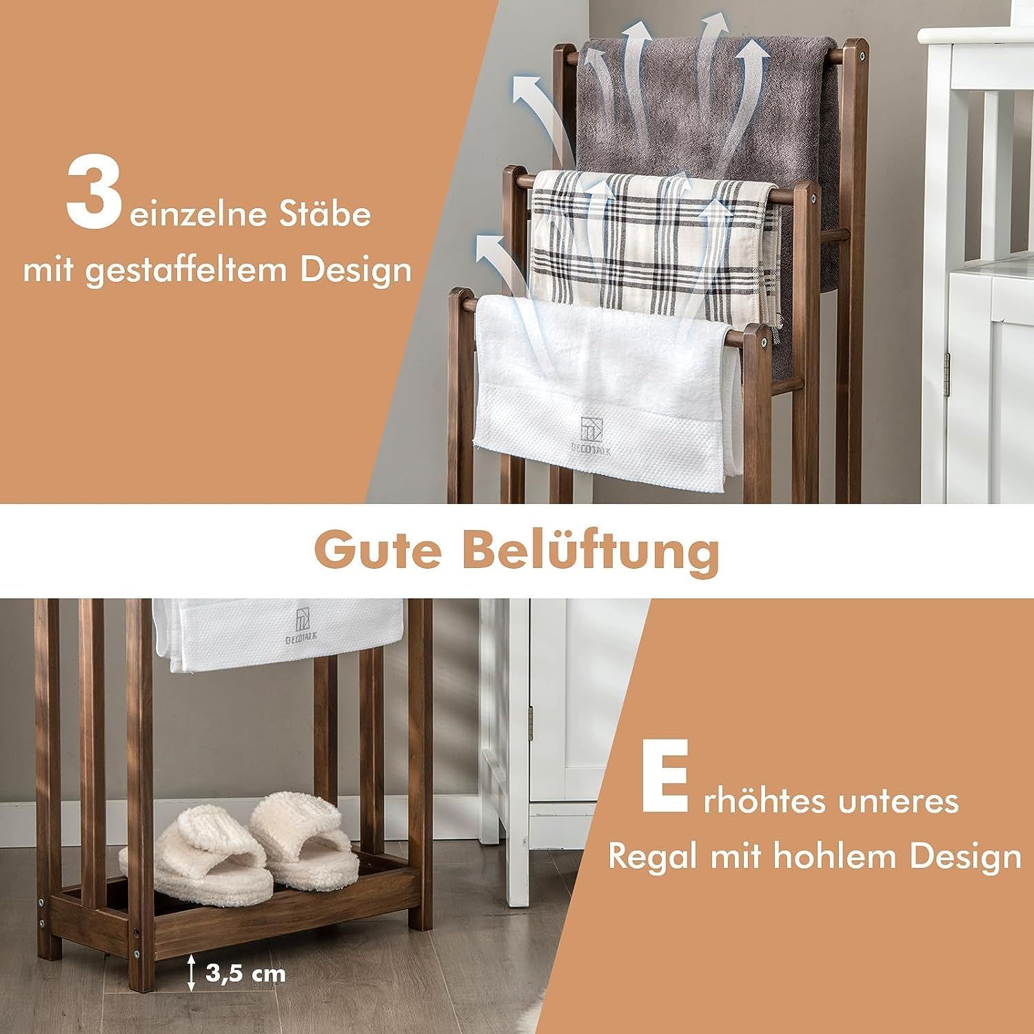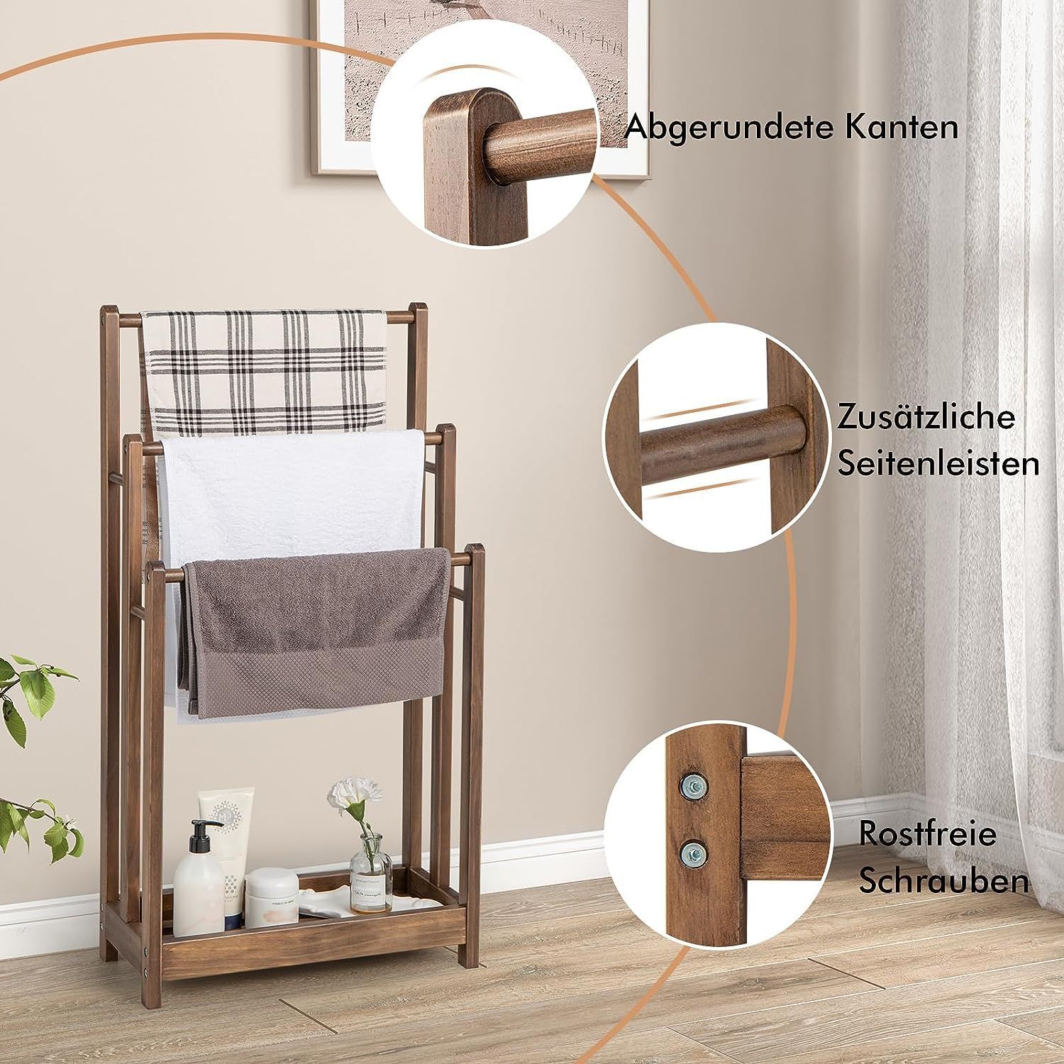 Handtuchständer braun freistehend, Handtuchhalter Holz mit 3 Handtuchstangen