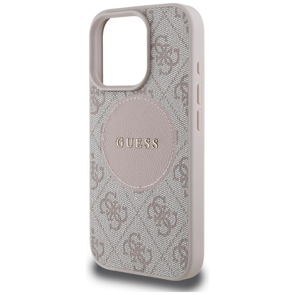 Guess Handyhülle iPhone 16 Pro Guess Kunstleder rosa MagSafe Logo goldfarben