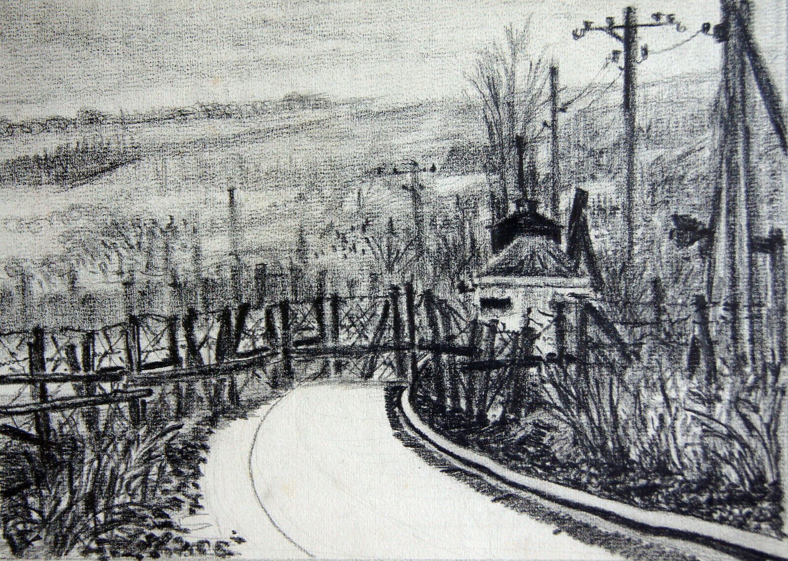 Bleistift-Zeichnung um 1960. Künstler: Peter Schadwinkel (geb. 1938 in Königsberg) . Unsigniert , aber mit Zertifikat. Motiv: Blockierter Schienenstrang durch die DDR zwischen Dankmarshausen und Gerstungen. Maße: Blatt H 25, B 31 cm. Mit diesem Bild erhalten Sie ein Echtheits-Zertifikat: Dieses Bild