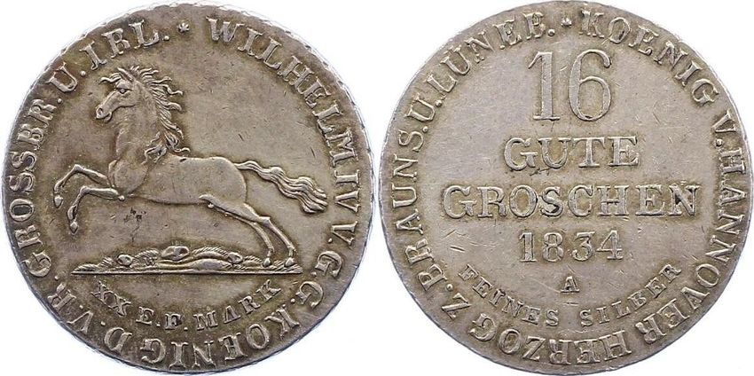 Hannover 16 Gute Groschen 1834 A ss-vz König Wilhelm IV