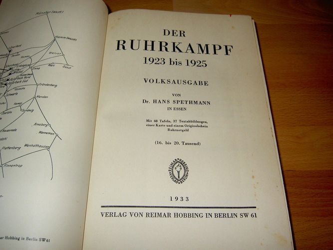 Volksausgabe, 16. bis 20. Tausend, erschienen 1933 im Verlag Hobbing, Berlin, Leinen, 276 Seiten. 48 Tafeln, 37 Textabbildungen, eienr Karte und einem Originalschein Ruhrnotgeld, Bibliotheksstempel am Vorsatzblatt, Innenseite der Buchdeckel etwas bräunlich verfärbt. fester Buchblock