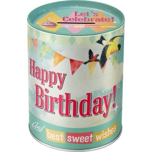 Happy Birthday birds Metall Spardose Deckel abnehmbar Höhe ca. 13 cm Durchmesser ca. 10 cm lizenzierte Neuware Versand Euro 5,--, egal wieviele sie bestellen Der Artikel kann auch gerne in unserem Ladengeschäft Retro World in 73563 Mögglingen - Lauterstr. 27 abgeholt werden ! Sie finden uns auch in