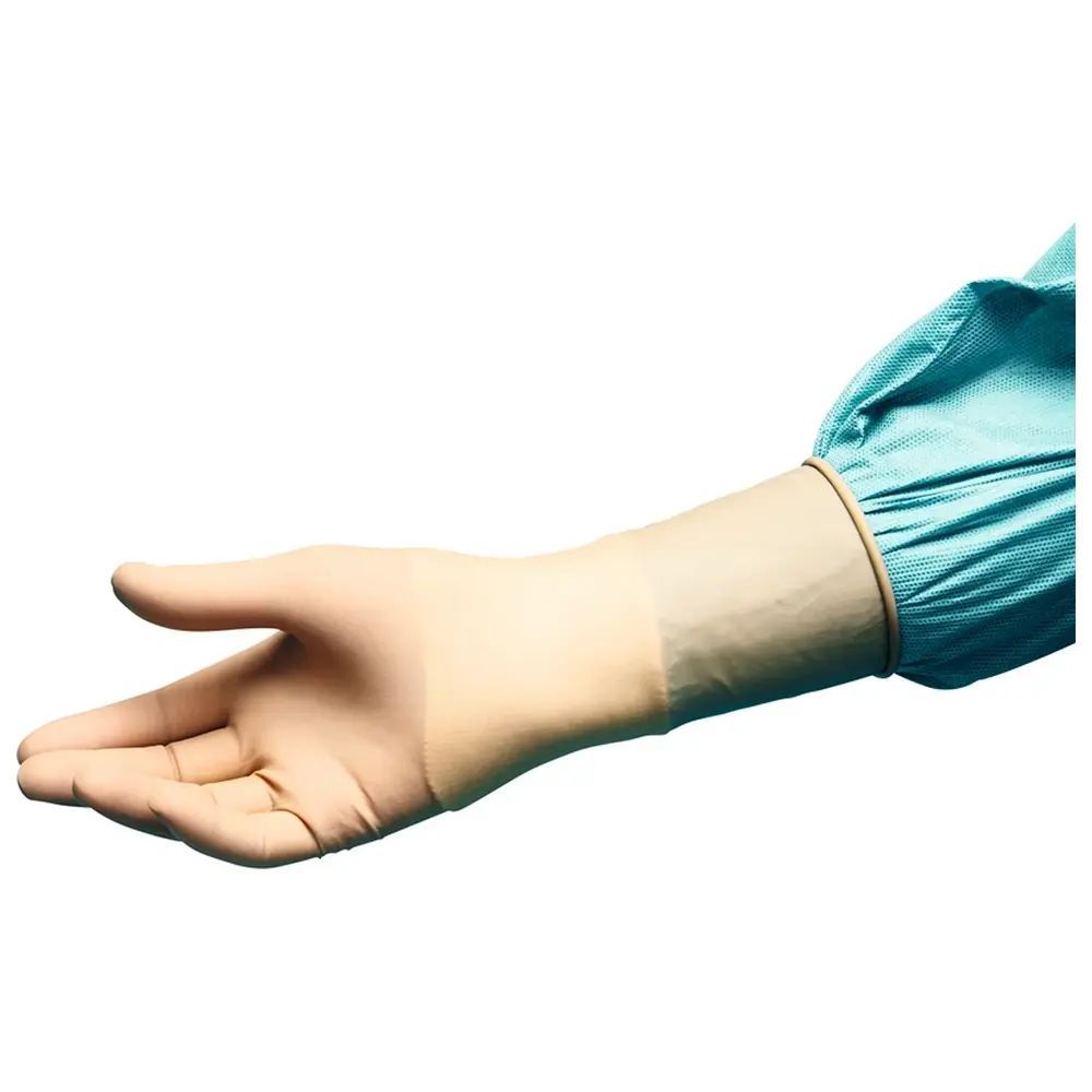 Puderfreie Einmal-OP-Handschuhe aus besonders dünnem und weichem Latex, insbesondere auch an den Fingerspitzen für ausgezeichnetes Tastempfinden, durch Polymer-Innenbeschichtung leicht anzuziehen, mit modifizierter mikrogerauter Oberfläche für optimale Griffigkeit, hochelastisch und reißfest, ermüdu