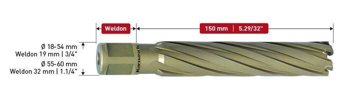Hartmetall-bestückter Kernbohrer xx mm , Weldonschaft 19 mm, Nutzlänge 150 mm,
