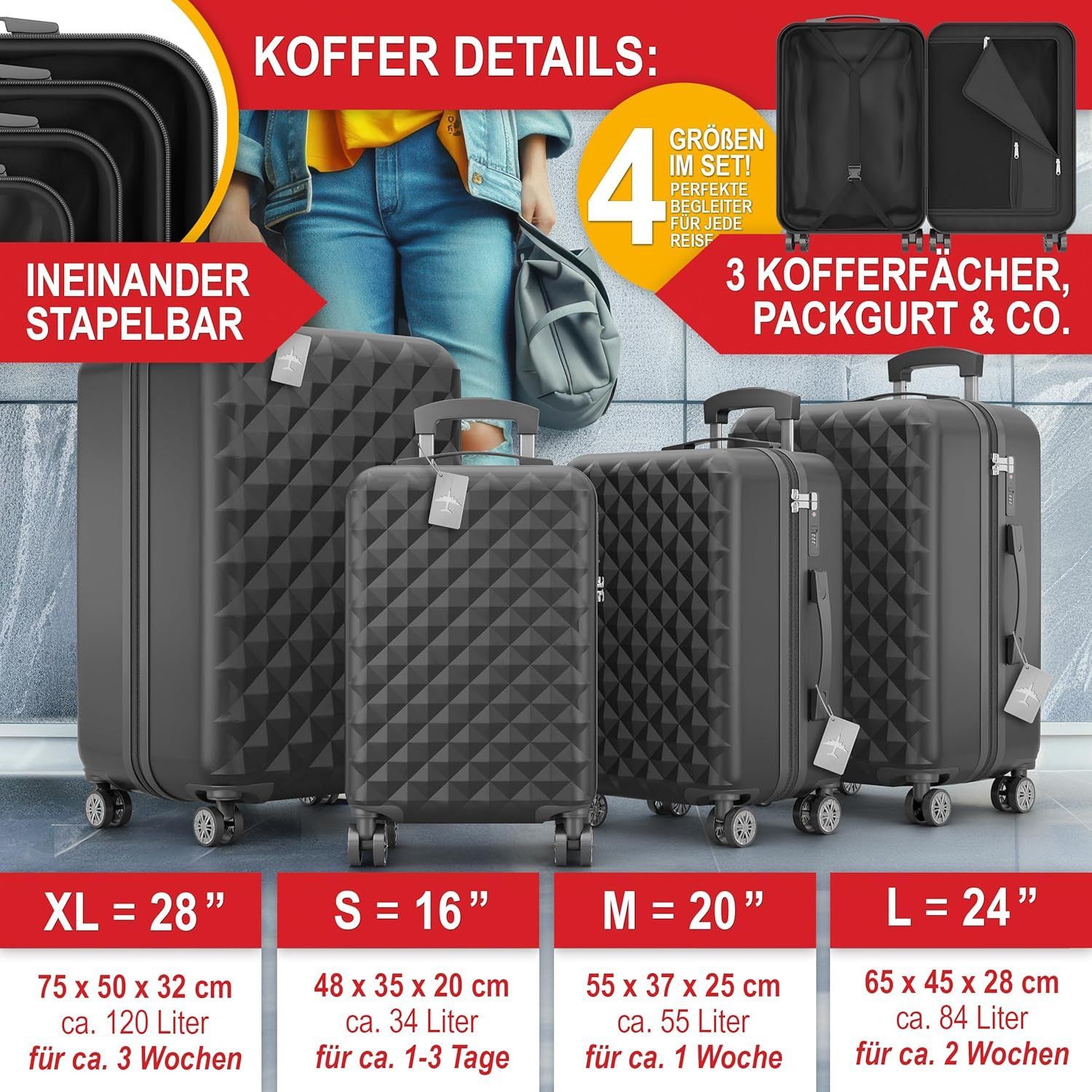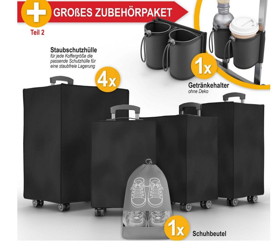 Umfangreiches Zubehörpaket inklusive - Kofferset Premium S-M-L-XL »Schwarz« Das 4-teilige Kofferset bietet Ihnen für jede Reise die perfekte Koffergröße, egal ob Urlaub, Geschäftsreise oder Kurztrip. Mit vier verschiedenen Größen (120 L, 84 L, 55 L, 34 L) finden Sie stets den idealen Begleiter für I