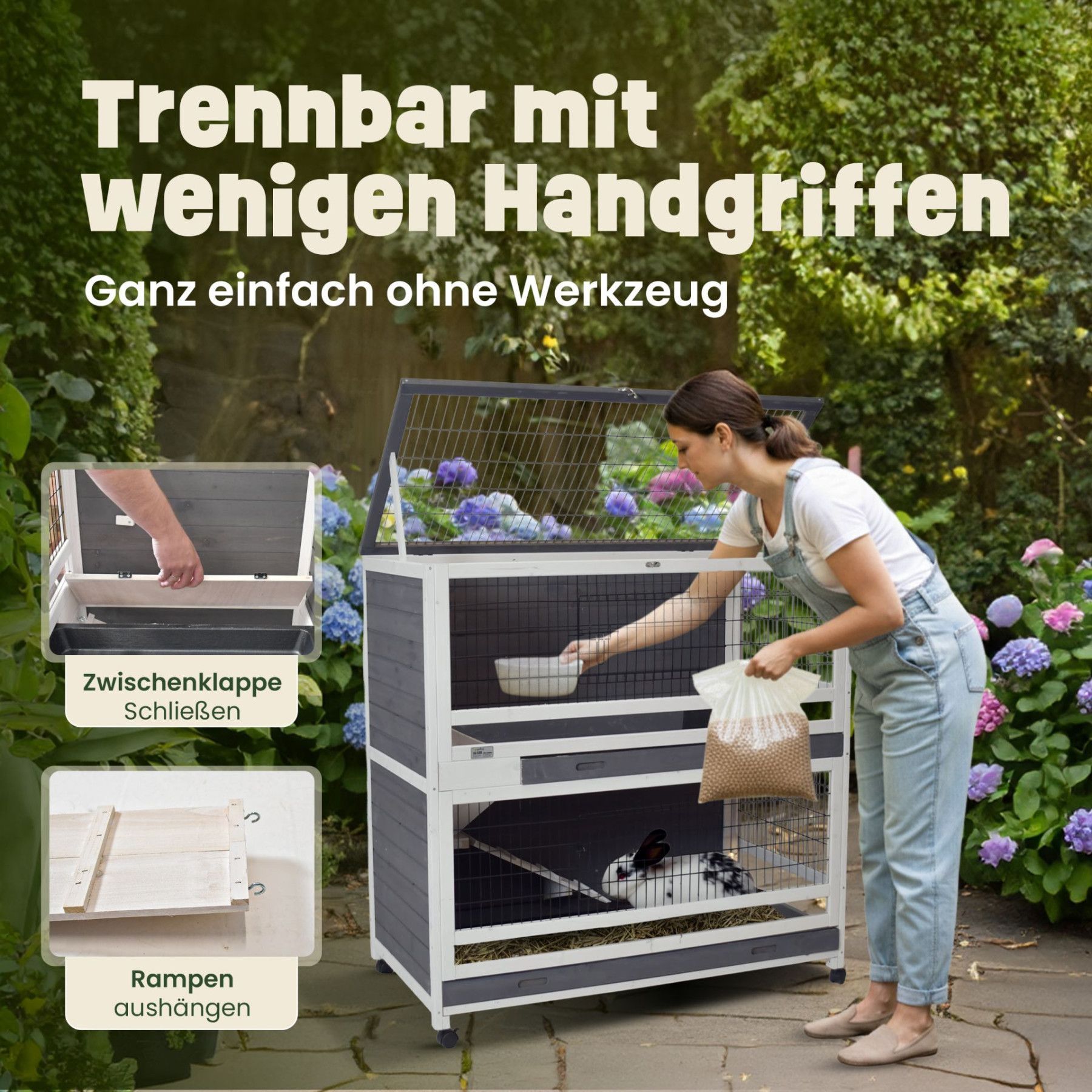 Oskar bietet auf zwei großzügigen Etagen jede Menge Platz und Komfort für deine Kaninchen, Meerschweinchen oder andere Kleintiere. Ob auf dem Balkon, im Garten oder im Innenbereich – der Stall überzeugt durch cleveres Design, hygienische Reinigung und flexible Nutzung. Geräumig und durchdacht Gesamt