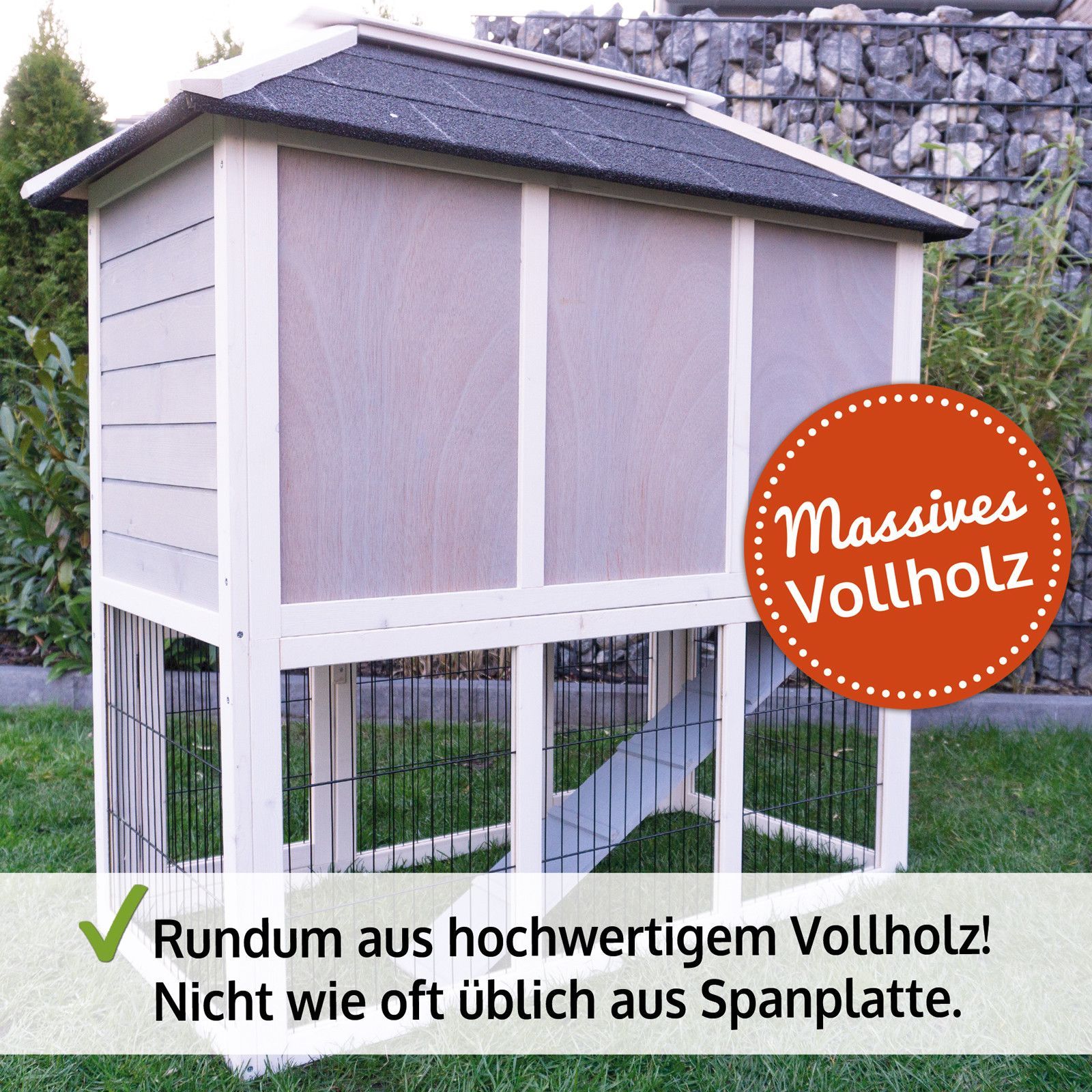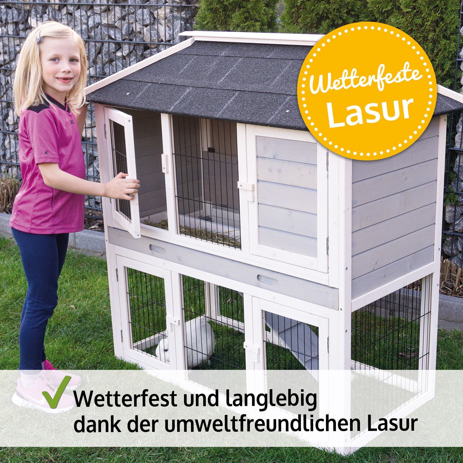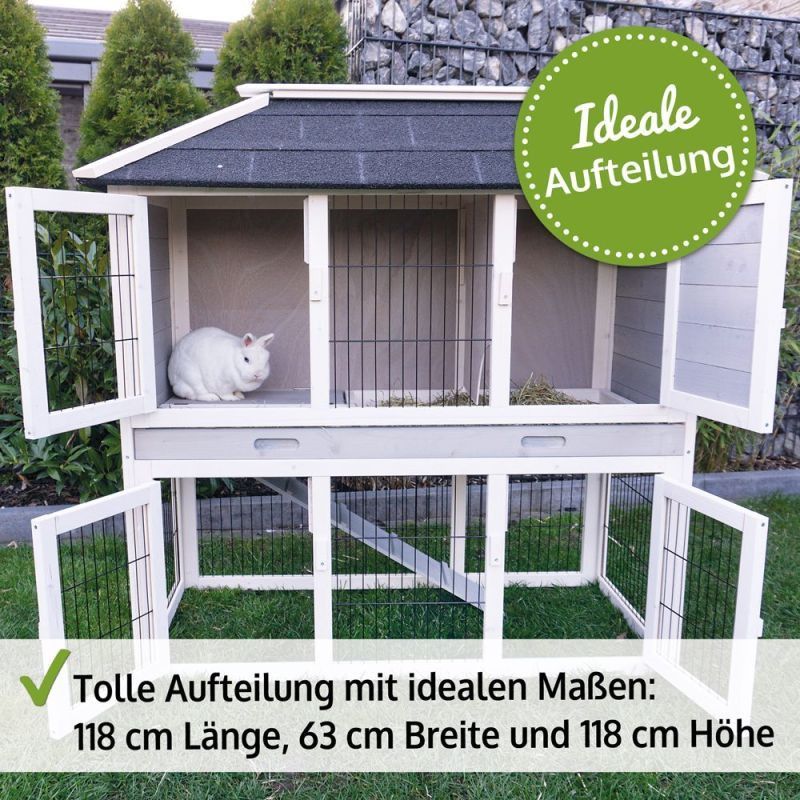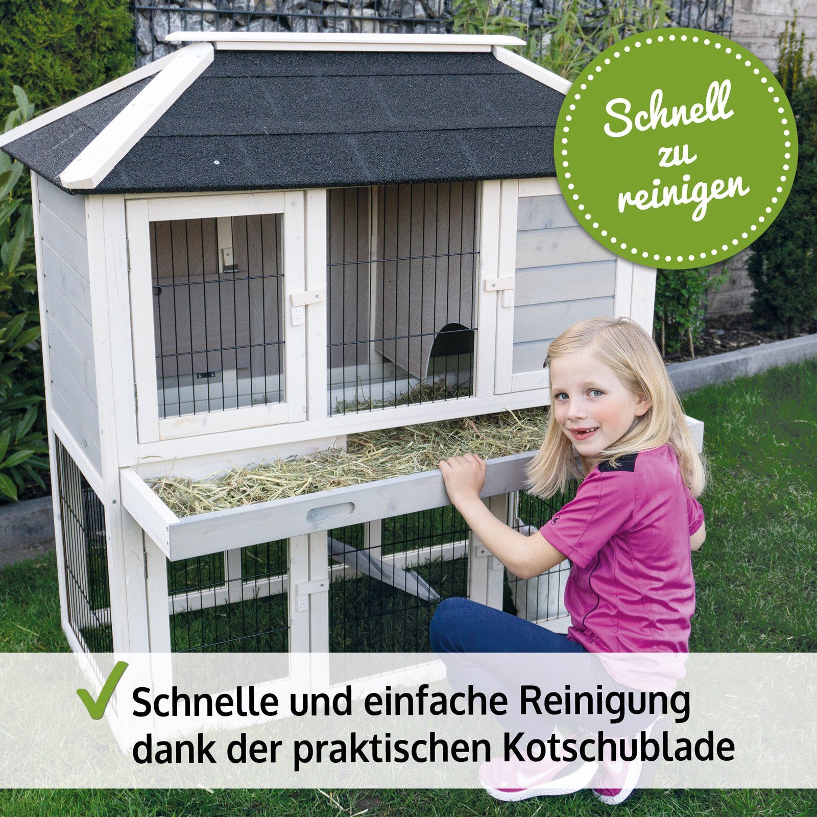 Hasenstall Stadtvilla Der Hasenstall Stadtvilla ist ein stilvoller Hingucker in Ihrem Garten. Dieser luxuriöse Kleintierstall besticht durch seine eleganten Weiß- und Grautöne und bietet Ihren Tieren ein komfortables Zuhause. Maße Größe: 118 x 118 x 63 cm (B x H x T) Großzügiges Gehege Geräumiges Ge
