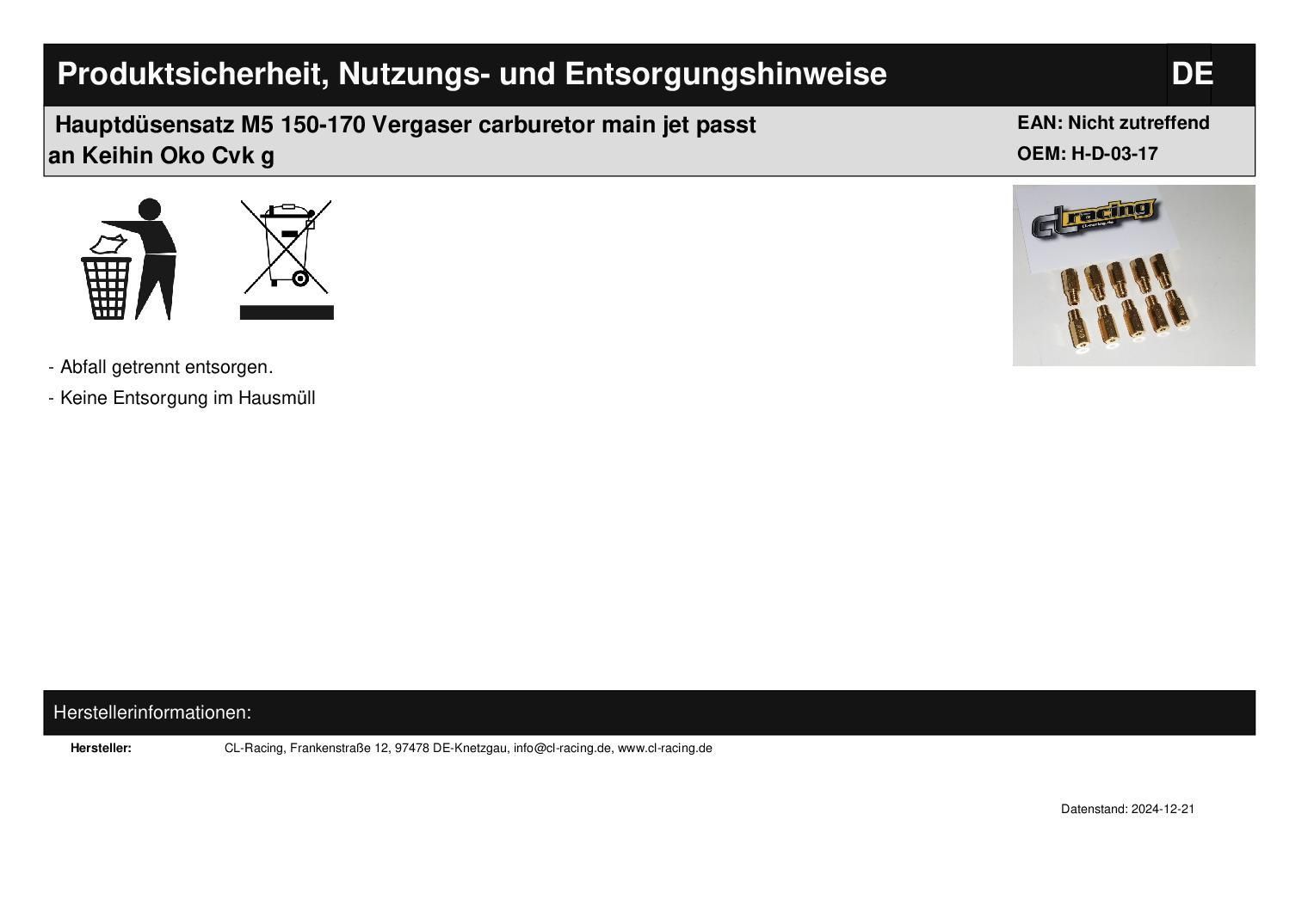 Hauptdüsensatz M5 150-170 Vergaser carburetor main jet passt an Keihin Oko Cvk g