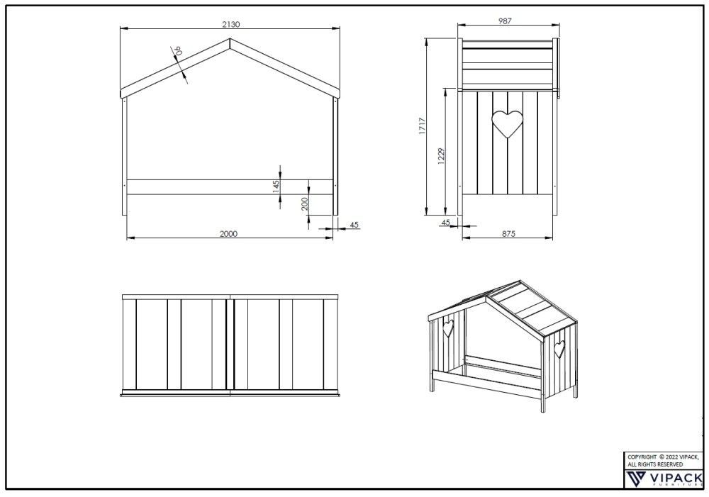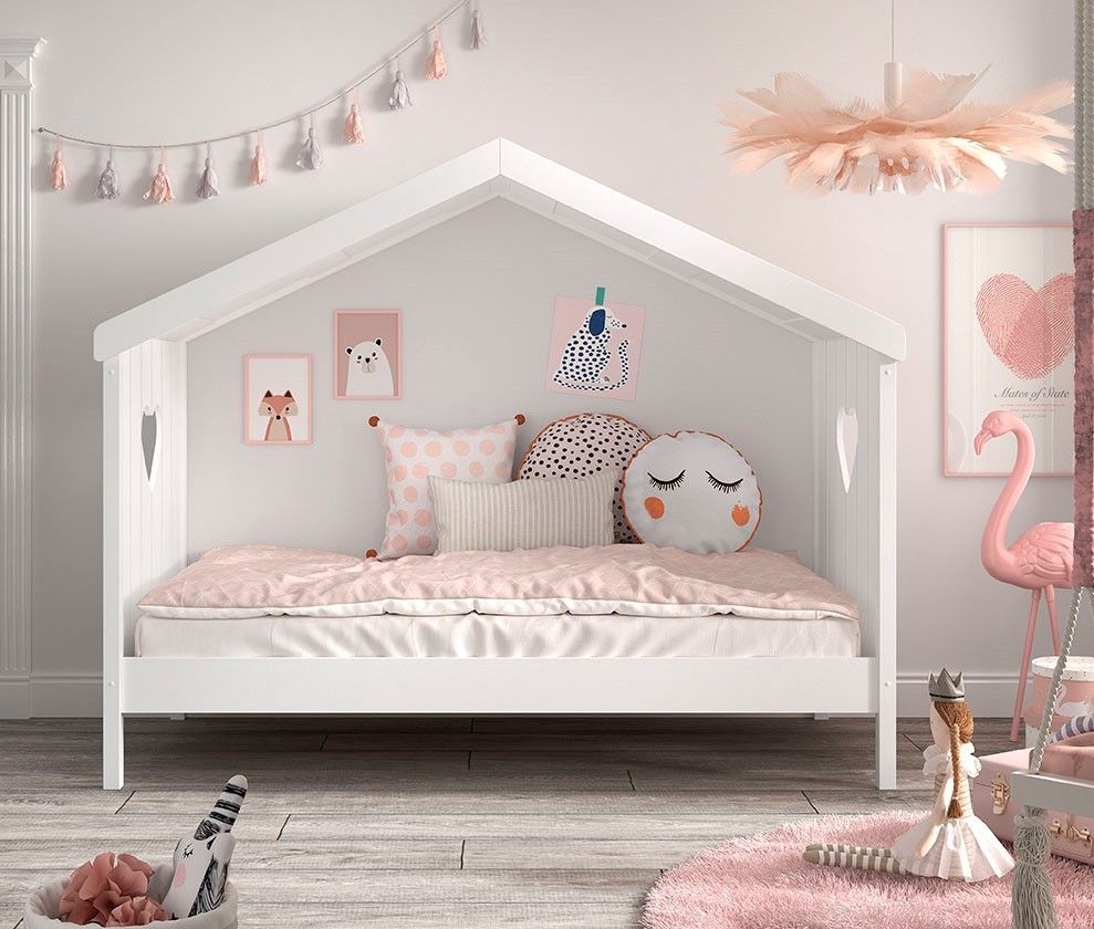 VIPACK Hausbett 90x200 Kinderbett Holzbett Einzelbett Lattenrost Herz Himmelbett Weiß