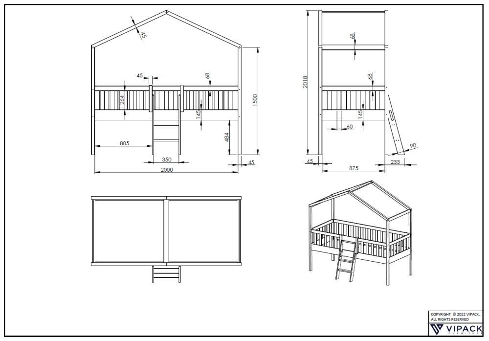 VIPACK Hausbett 90x200 Kinderbett Spielbett Holzbett Hochbett Lattenrost Leiter Weiß