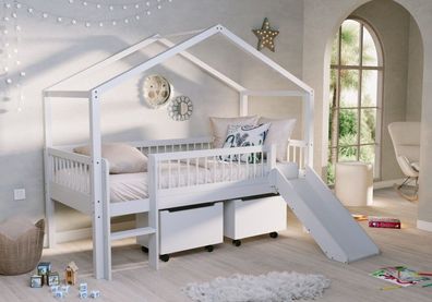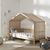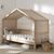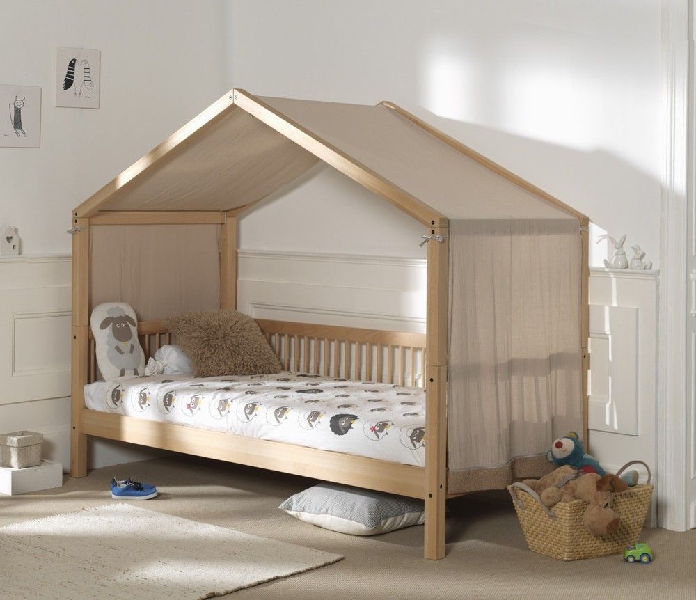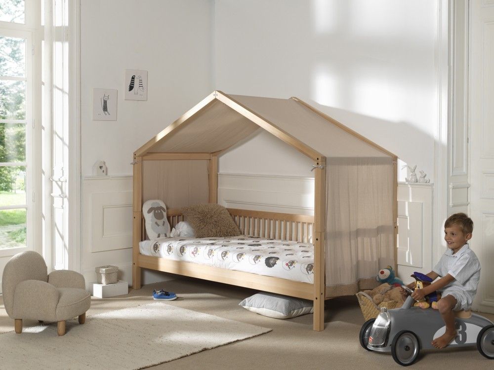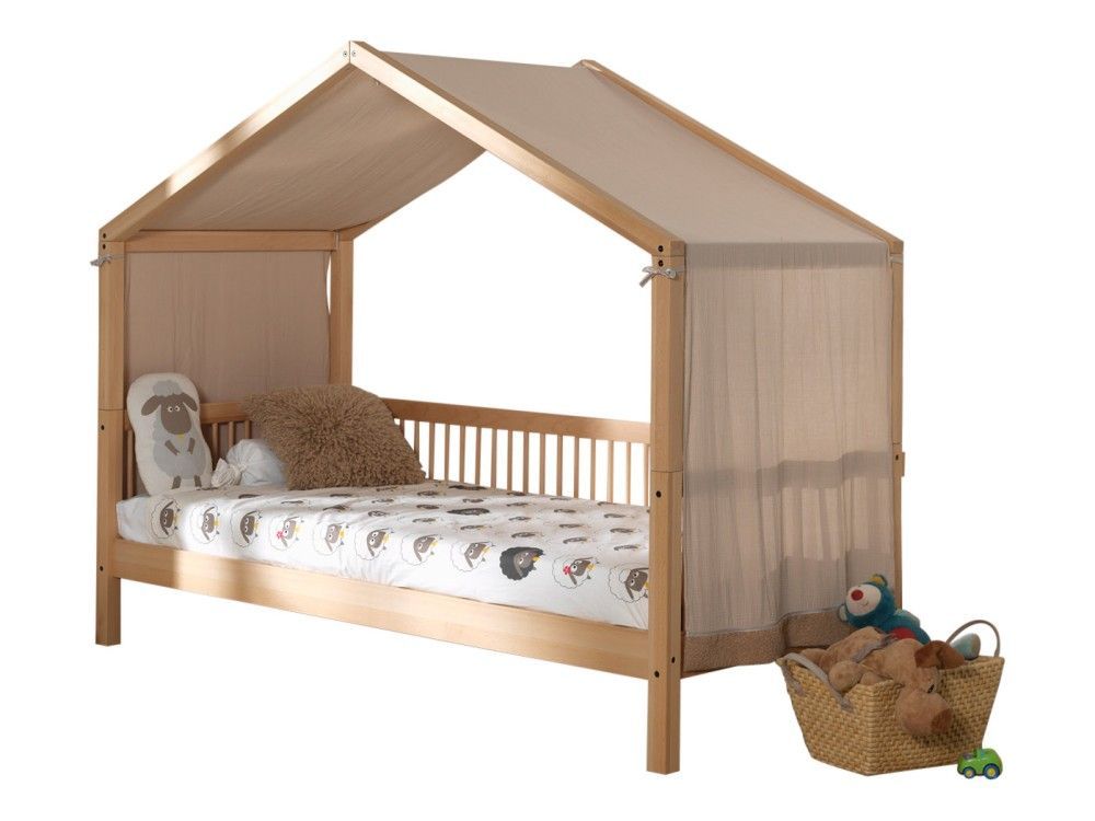 VIPACK Hausbett Kinderbett 90x200 Textilhimmel Lattenrost Spielbett Buche massiv Natur