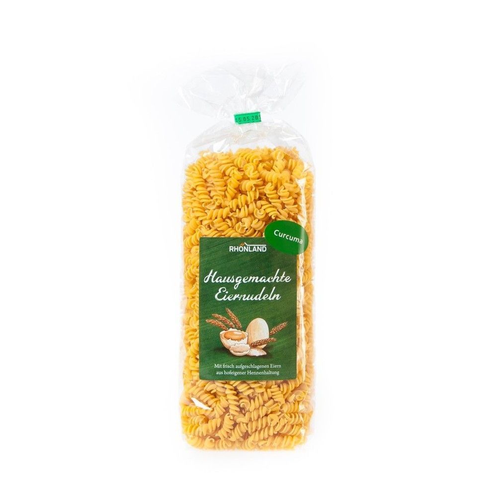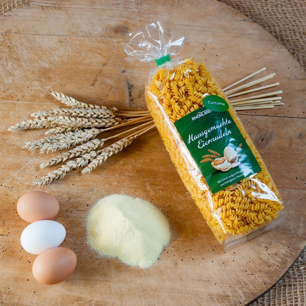 Zutaten: Hartweizengrieß*, 30% Eier**, 0,2% Curcuma gemahlen***, Kochsalz, Herkunft: *EU, **Deutschland, ***Nicht-EU; Allergene: Gluten, Ei (Hühnereiweiß), * kann Spuren von Soja, Senf, Lupine enthalten; Mindesthaltbarkeit: 1 Jahr; Hinweis: Teigwaren nicht roh verzehren, wir empfehlen unsere Hausmacher Eiernudeln 6 bis 8 Minuten zu kochen