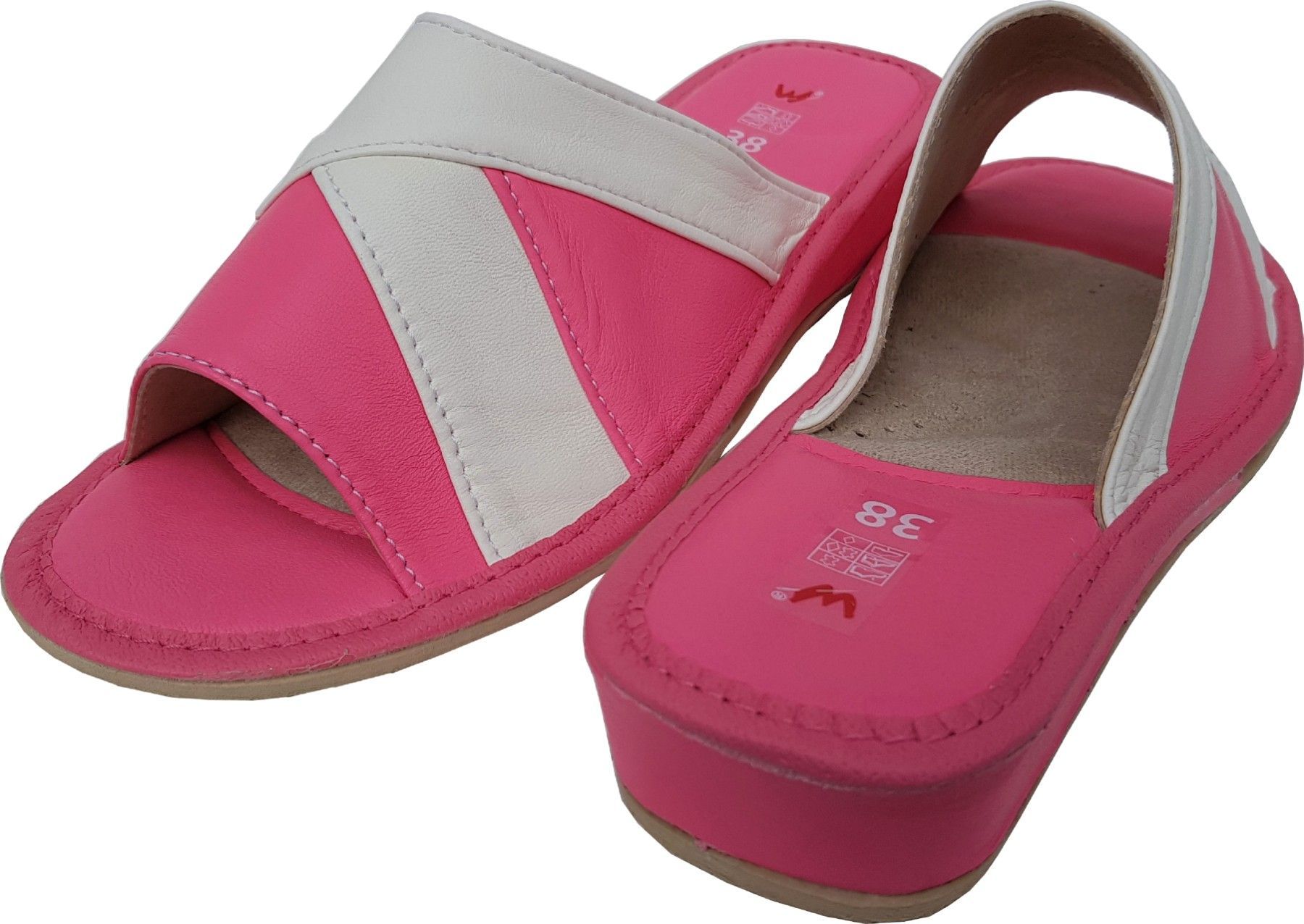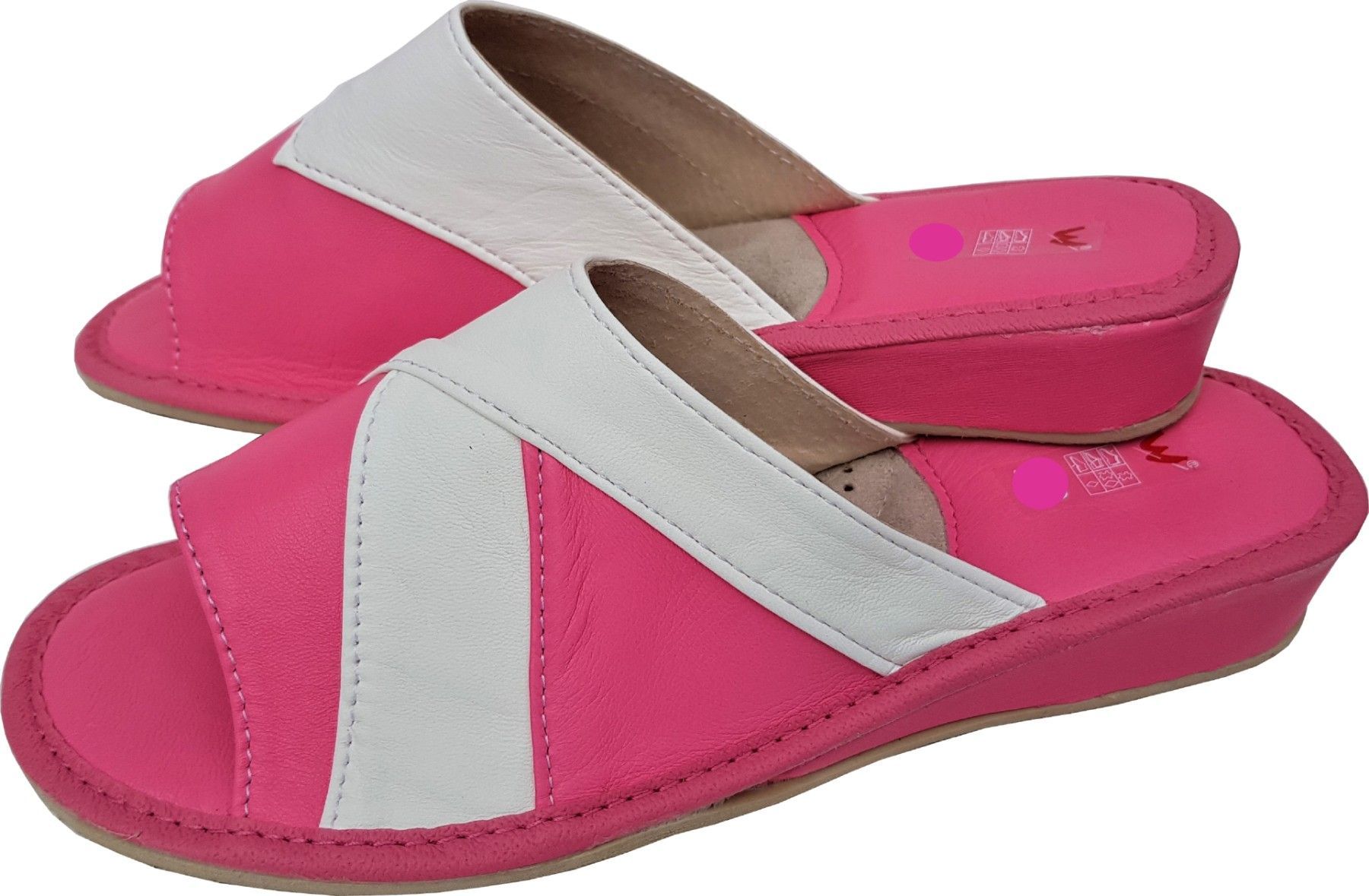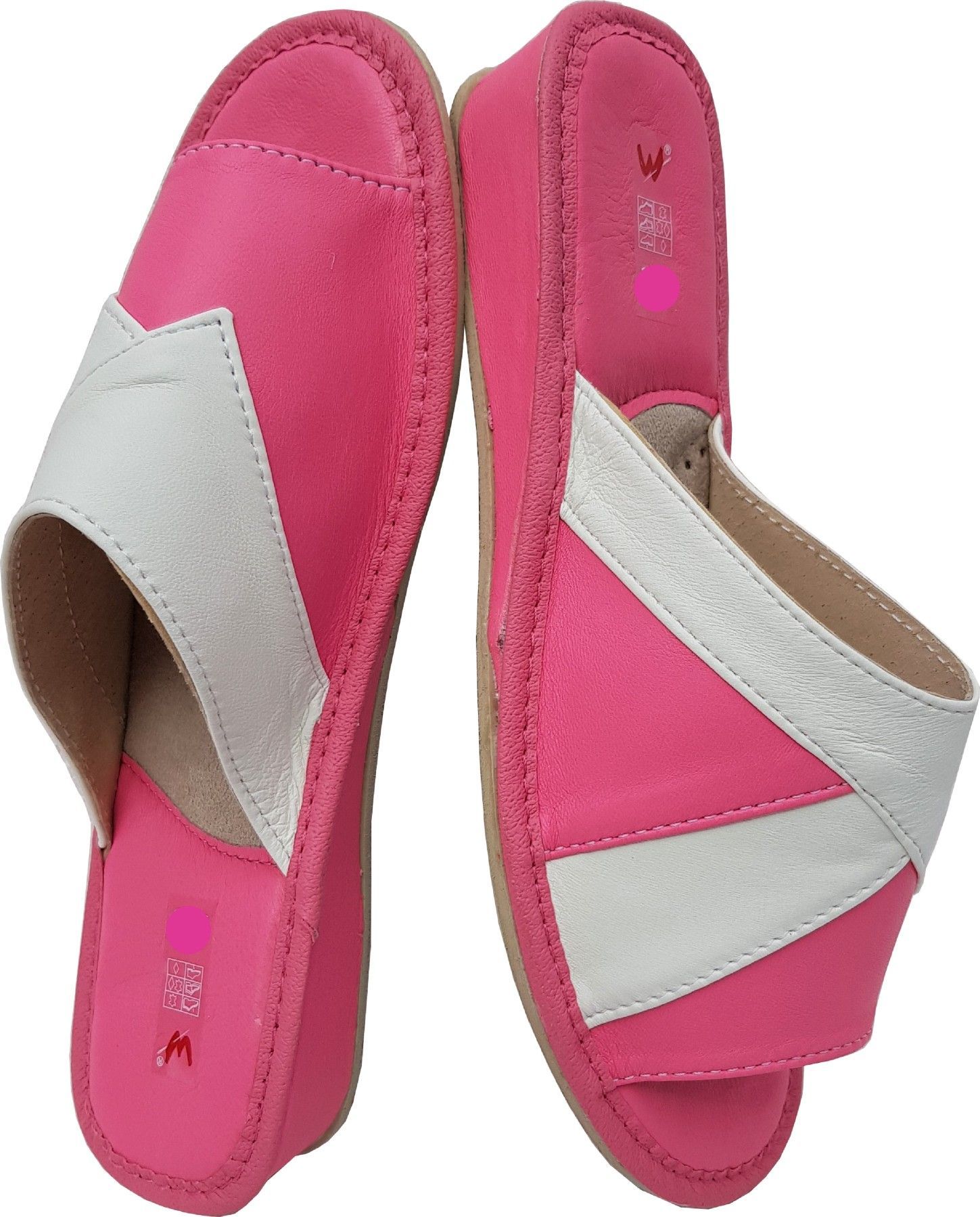 Sehr schöne und bequeme Hausschuhe - Latschen - Pantolette Gr. 35-36-37-38-39-40-41 * ROSA - WEISS* Obermaterial aus hochwertigem Leder (Kalb) Mit kompletter Lederinnenaustattung und mit dem Fussbett Die Sohle besteht aus Gummi (rutschfest) Absatz ca. 3,9 cm Neu, keine billig Ware, stabile Ausführun