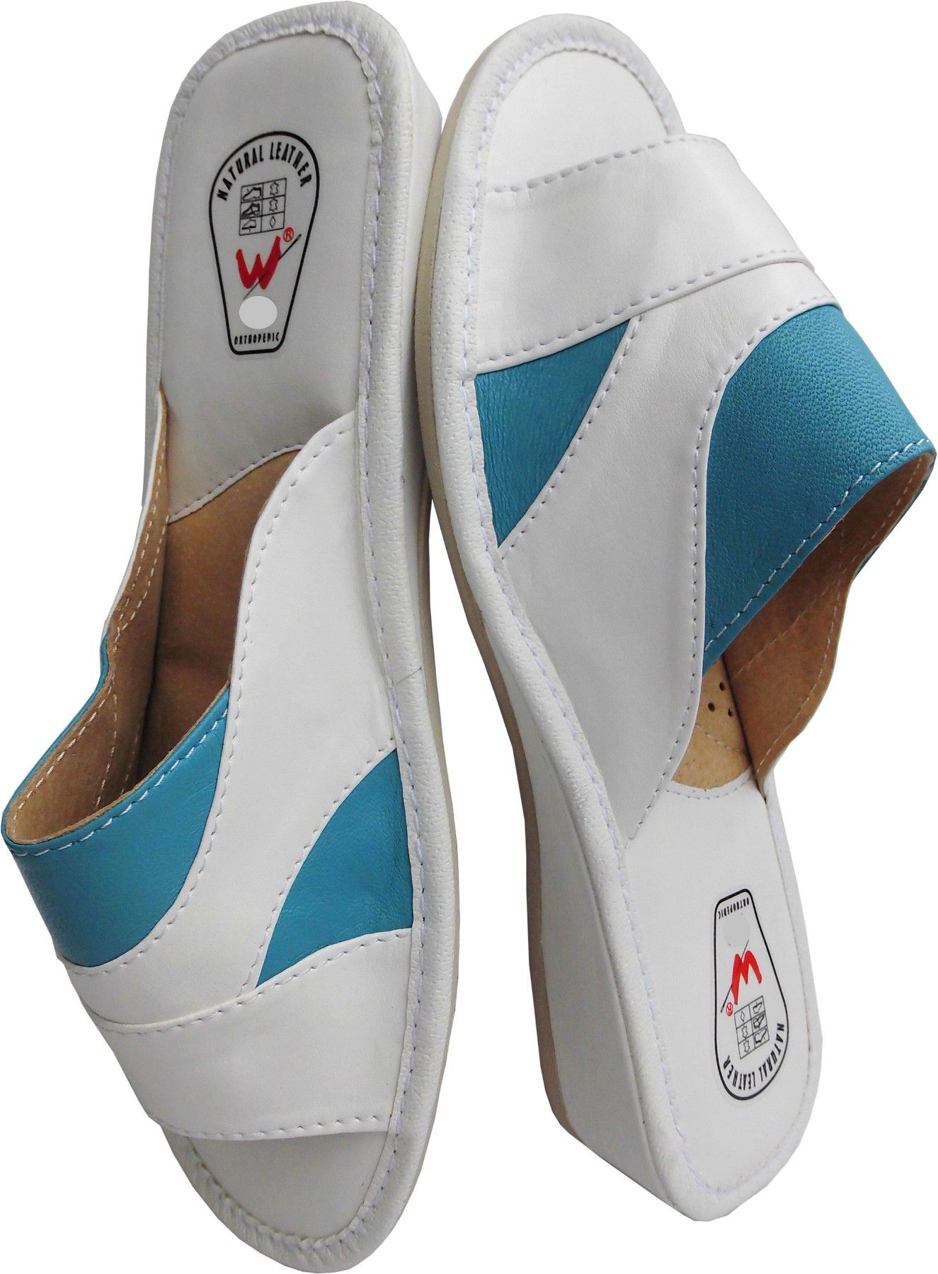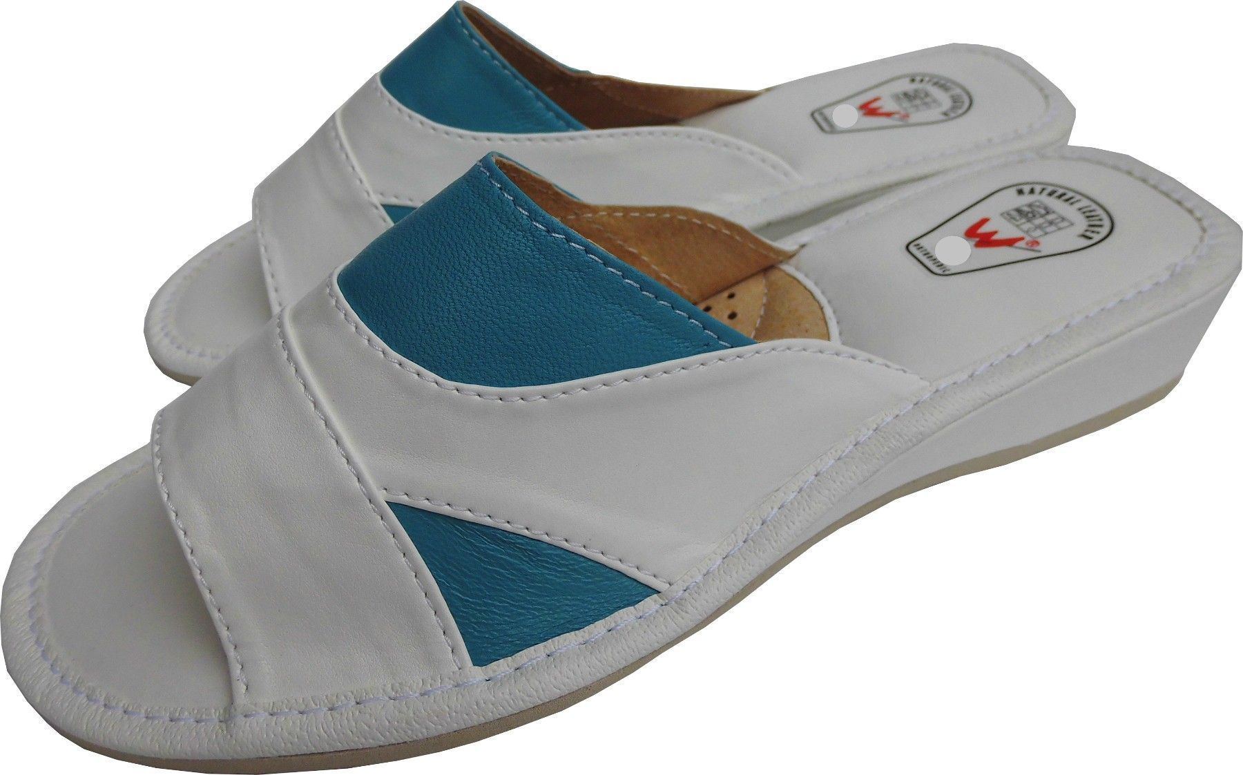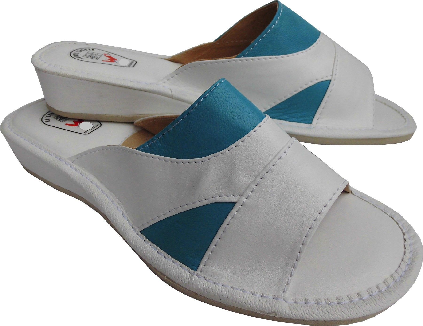 Sehr schöne und bequeme Hausschuhe - Latschen - Pantolette Gr. 35-36-37-38-39-40-41 *Weiss - BLAU* Obermaterial aus hochwertigem Leder (Kalb) Mit kompletter Lederinnenaustattung und mit dem Fussbett Die Sohle besteht aus Gummi (rutschfest) Absatz ca. 3,9 cm Neu, keine billig Ware, stabile Ausführung