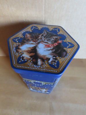• Blechdose leer 6Eckig blau mit Katzen Keksdose Bonbondose ca. 15,5cm h