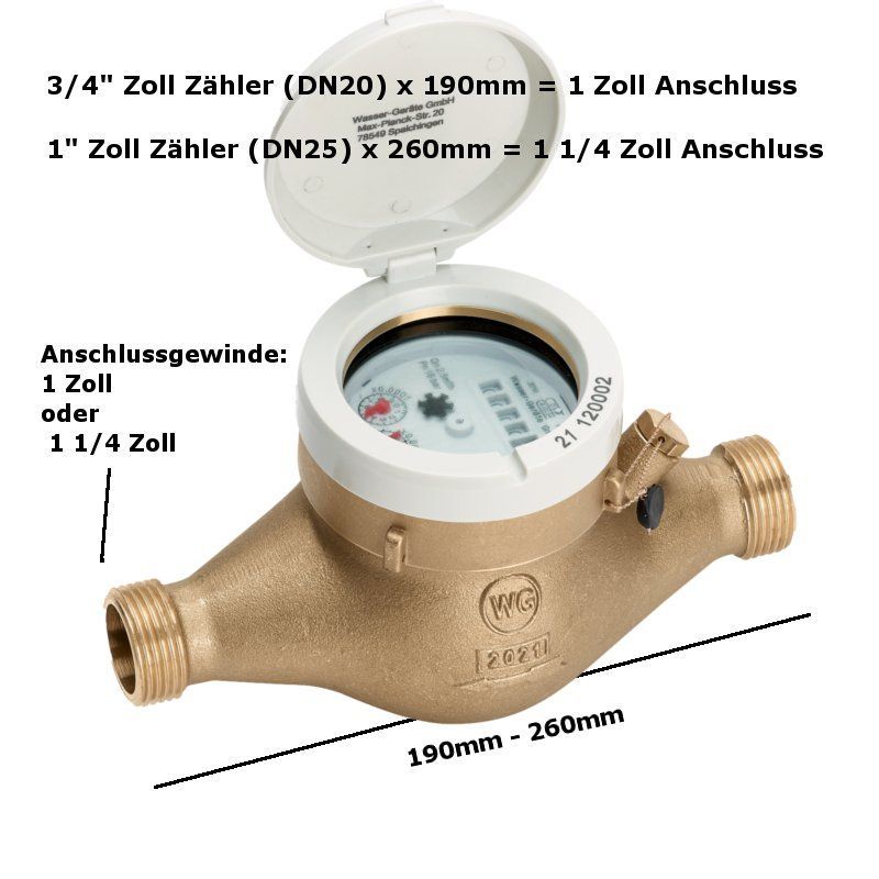 Hauswasserzähler 2023, Wasseruhr kalt, warm, 3/4 Zoll, 1 Zoll x 190mm, 260mm
