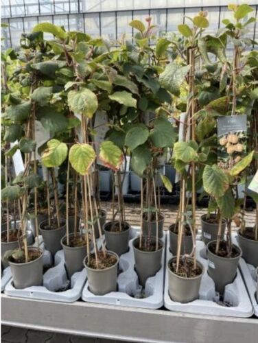 Hayward weibliche Kiwipflanze, ca. 60-100 cm groß und bereits gestäubt, ideal für den Anbau im Außenbereich. Diese kräftige Kiwi-Pflanze ist schnellwüchsig, blühend und mehrjährig, und eignet sich besonders gut für gemäßigte bis tropische Klimazonen. Ihr handförmiges Blattwerk und kletternder Wuchs