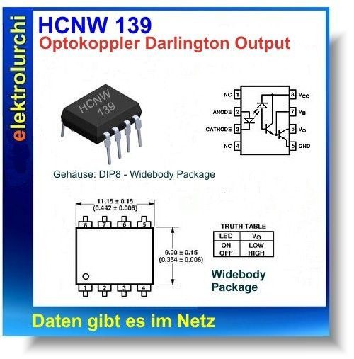 Sie bieten hier auf folgenden Artikel NEU 2 Stück HCNW139 - Optokoppler Darlington Output, DIP8 Wide Body, HP Gehäuse: DIP8 Wide Body Hersteller: HP Daten gibt es im Netz