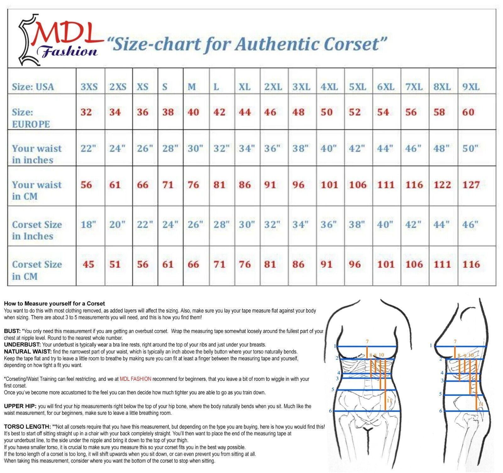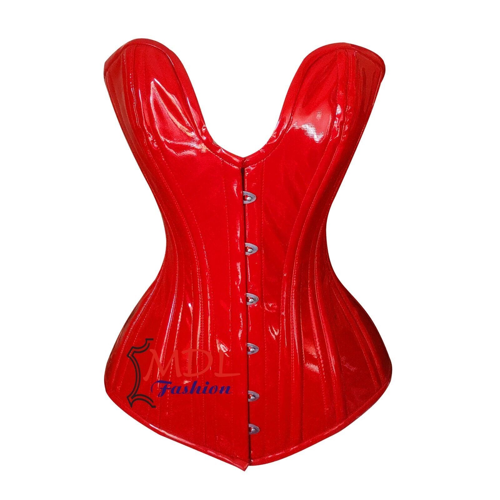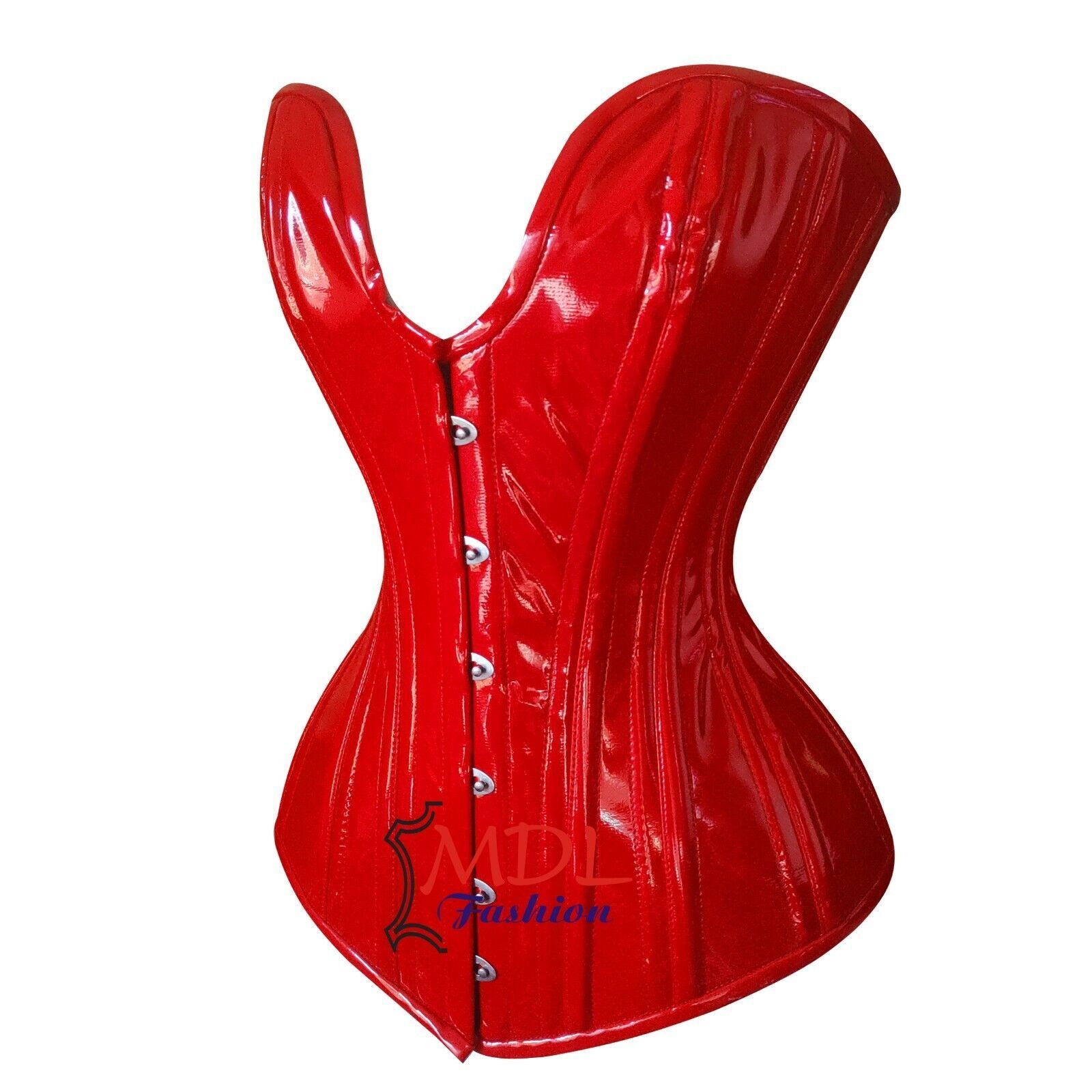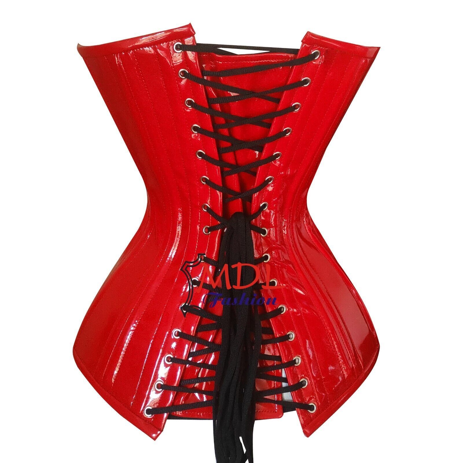 Description Women Corset, Overbust Corset, Sweetheart shaped, waist training steel boned corset bustier Corset Detail Outer Shell: PVC Vinyl Inner Shell: 100% Cotton Twill Underwired: 100% Steel Bones Closure: Rust free metal claps Corset Front Length: 15 Corset Side Length: 14.5 Corset Back Length: