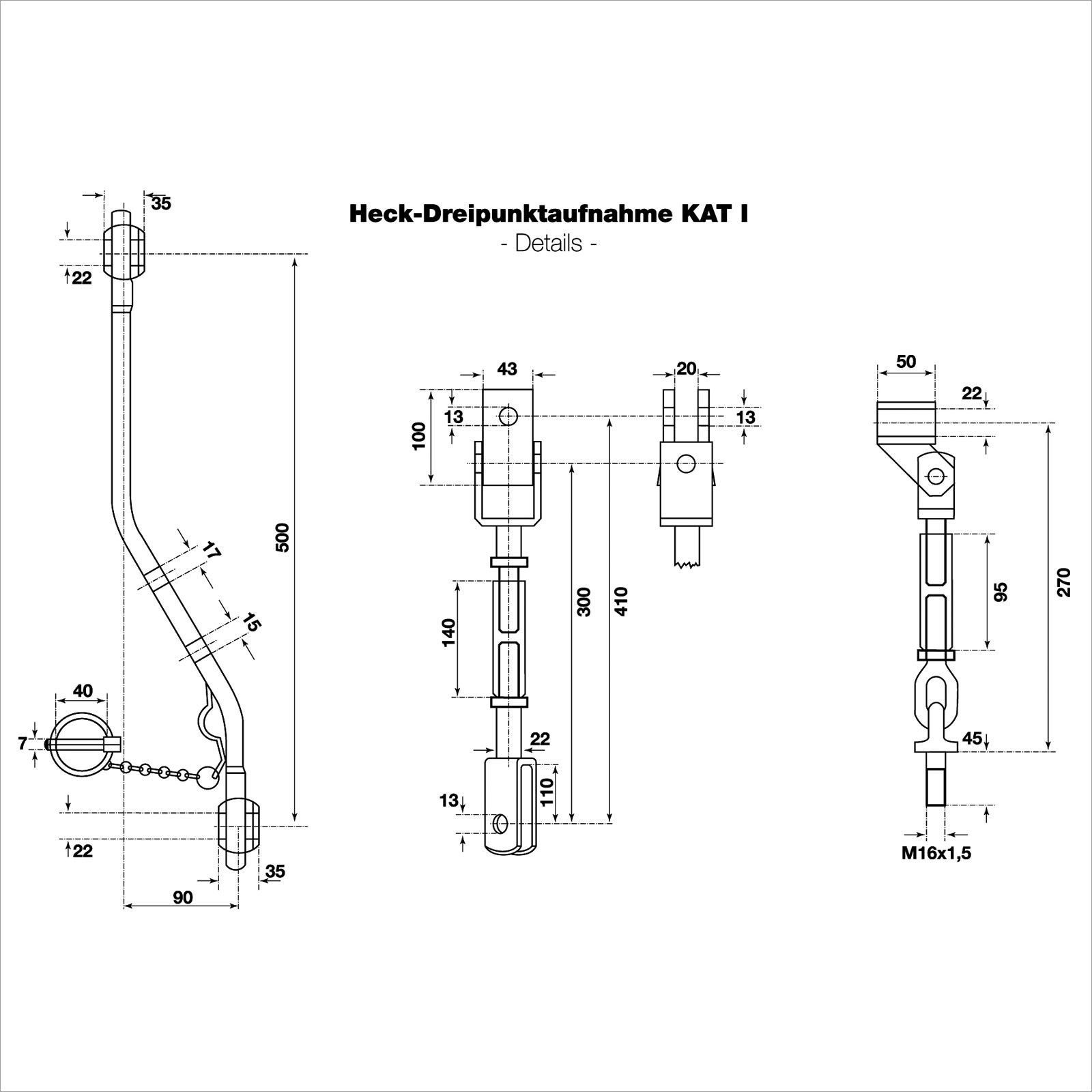 Heck-Dreipunktaufnahme 3-Punkt-Aufnahme für Kleintraktor Traktor Schlepper Kat1 Mit der DEMA Heck-Dreipunktaufnahme für Kleintraktoren der Kategorie 1 (Kat. I) finden Sie eine zuverlässige und flexible Lösung für Ihre Traktoraufhängung. Diese hochwertige 3-Punkt-Aufnahme ermöglicht es Ihnen, Ackerschienen und Anbaugeräte sicher und stabil an Ihrem Traktor zu montieren. Die individuell anpassbare Breite und Höhe sorgt dafür, dass der Dreipunkt-Mechanismus zu vielen gängigen Kleintraktoren wie Gutbrod, Iseki, Kubota, Hako, Yanmar, Mitsubishi und vielen anderen Marken passt. Stabile Bauweise und hohe Belastbarkeit Die DEMA Heck-Dreipunktaufnahme besteht aus stabiler Vollmetallausführung und ist teilweise verzinkt, was für eine hohe Langlebigkeit und Korrosionsbeständigkeit sorgt. Mit einer maximalen Belastung von 4,5 t ist die Aufnahme für den professionellen Einsatz geeignet und bietet zuverlässigen Halt für verschiedene Anbaugeräte. Die Lieferung erfolgt zerlegt, was eine unkomplizierte Montage ermöglicht. Produktmerkmale der DEMA Heck-Dreipunktaufnahme Stabile Vollmetallausführung: Robuste und langlebige KonstruktionTeilverzinkt: Hohe KorrosionsbeständigkeitIndividuell anpassbar: Passt auf viele gängige KleintraktorenMax. Belastung: 4,5 t für den professionellen EinsatzFlexibilität: Anpassbare Breite und Höhe für optimale Passform Technische Daten der DEMA Heck-Dreipunktaufnahme Länge der Unterlenker (Auge zu Auge): 500 mmAußenmaße im aufgebauten Zustand (BxTxH): 55x55x45 cmGewicht: Ca. 16 kg Die DEMA Heck-Dreipunktaufnahme für Kleintraktoren bietet eine universelle Lösung, die sich an Ihre Bedürfnisse anpassen lässt und Ihre Traktoren für verschiedene Anbaugeräte fit macht. Dank der stabilen Bauweise und der hohen Belastbarkeit haben Sie immer die nötige Sicherheit und Zuverlässigkeit, die Sie für Ihre Arbeiten im landwirtschaftlichen Bereich benötigen. Technische DatenMaße siehe BilderLänge der Unterlenker von Auge zu Auge: 500 mmMax. Belastung: 4,5 tAußenmaße im aufgebauten Zustand BxTxH: 55x55x45 cmGewicht: Ca.16 kg