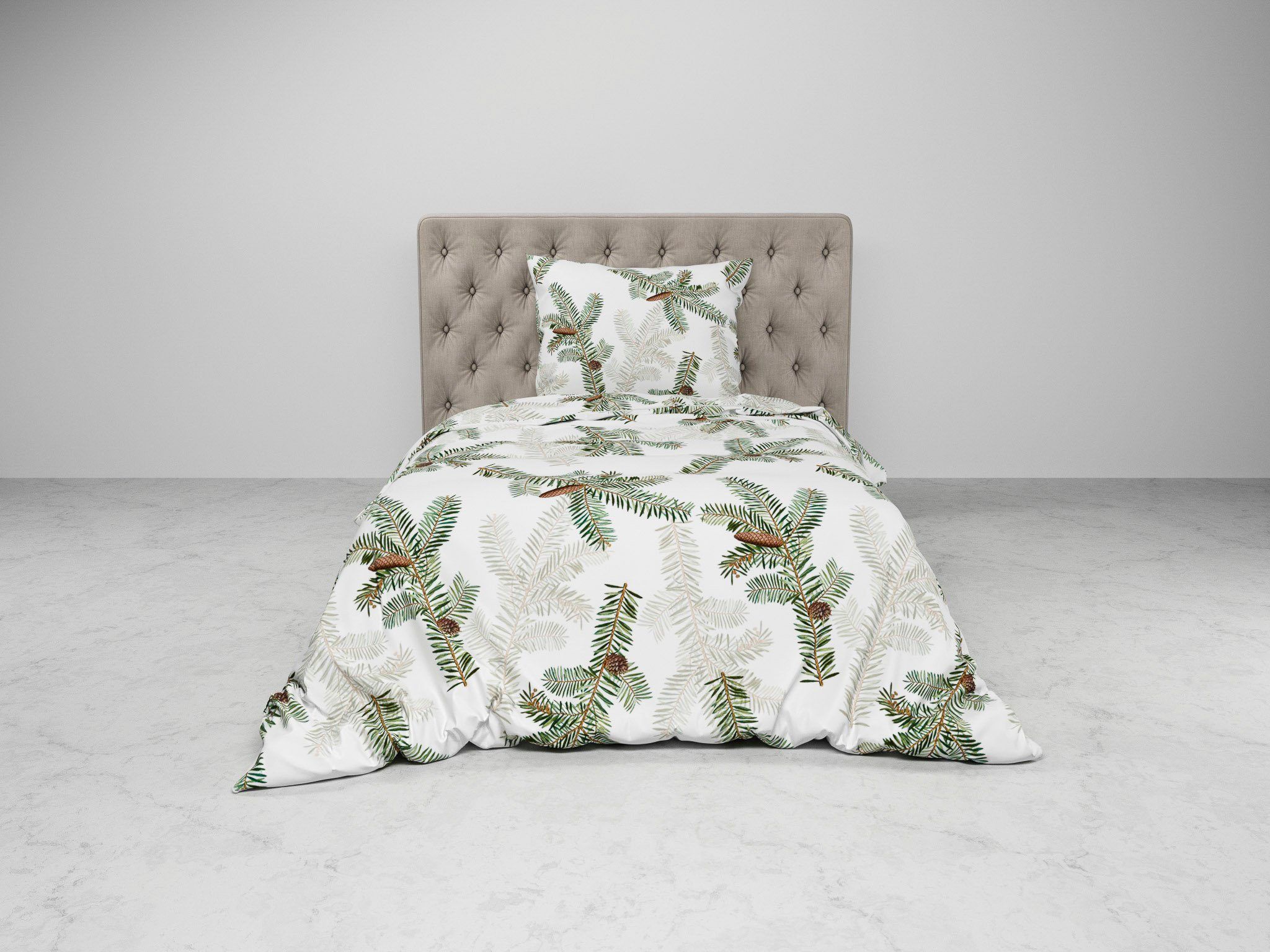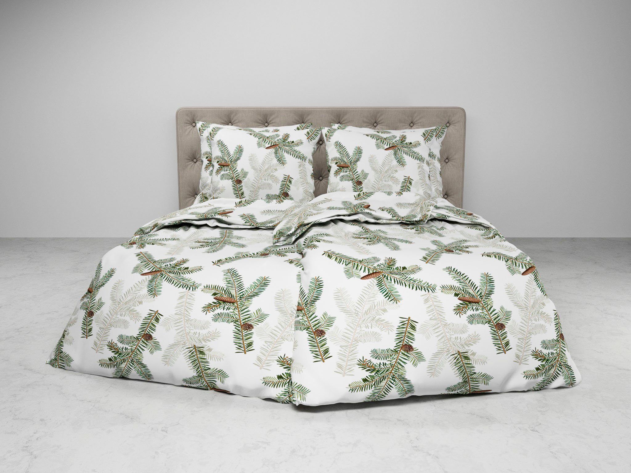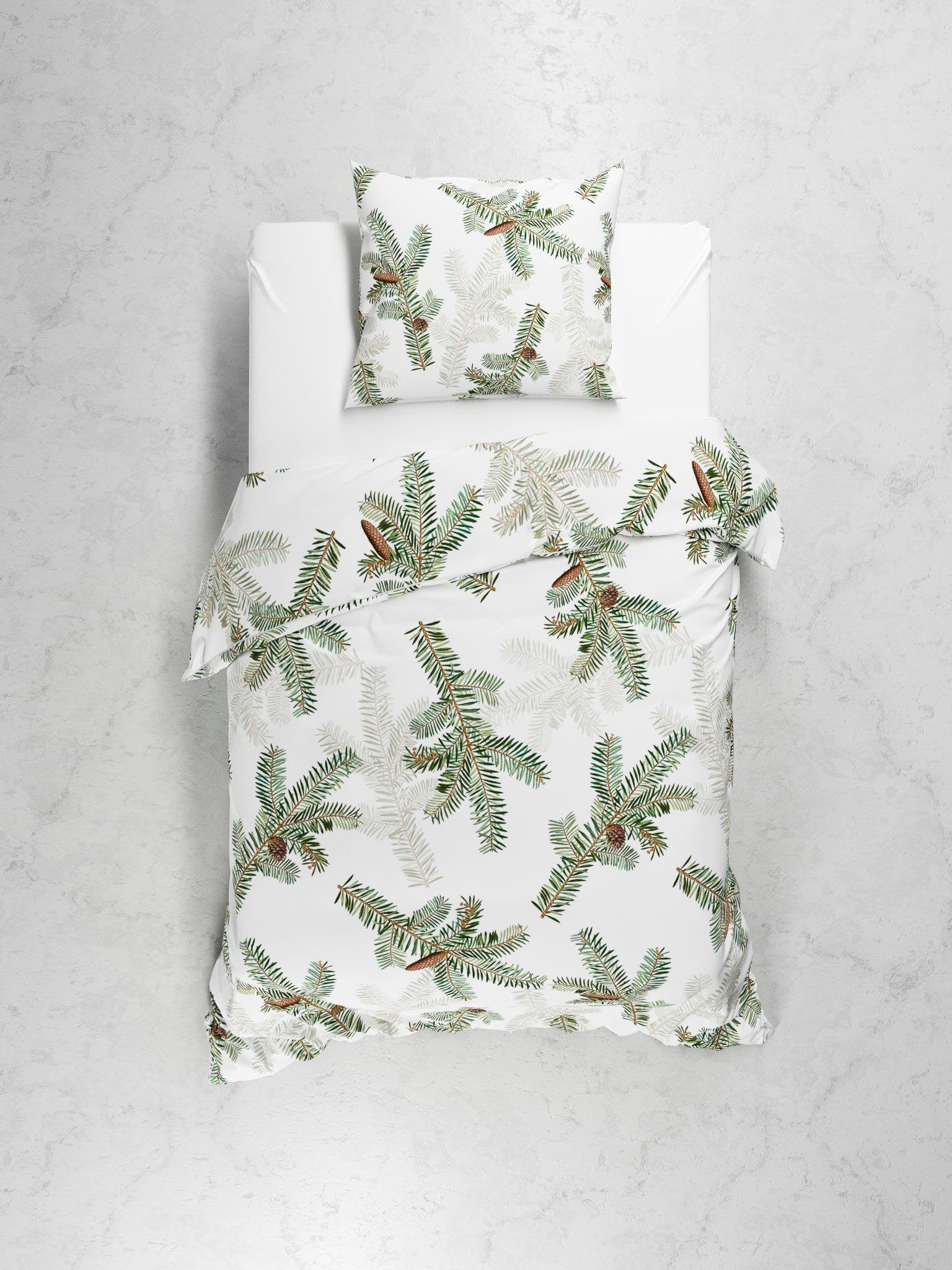 Heckett & Lane Flanell Bettwäsche 135x200 Bial Timid White Tannenzweige grün