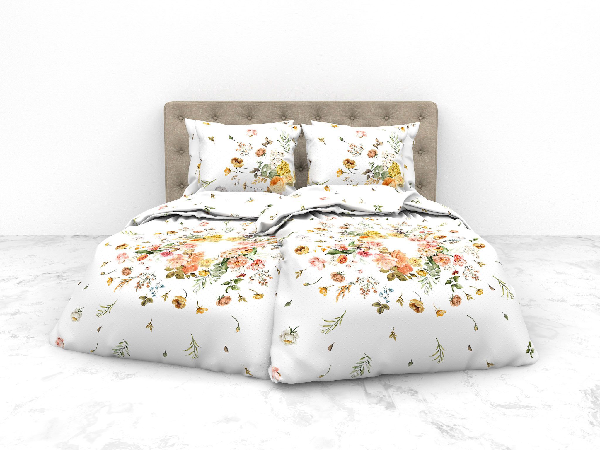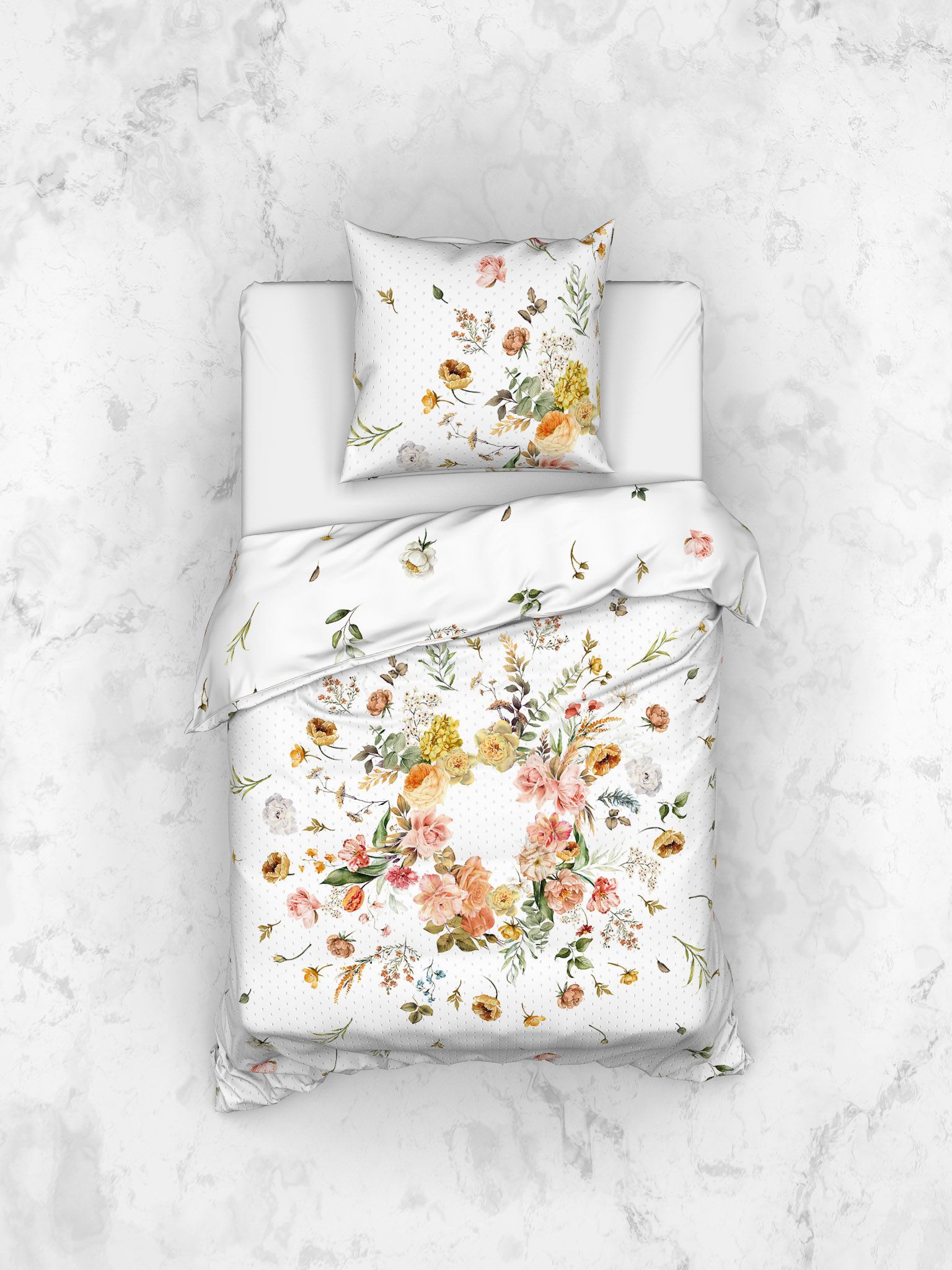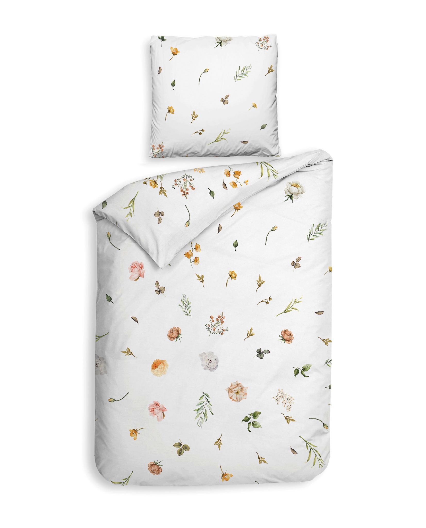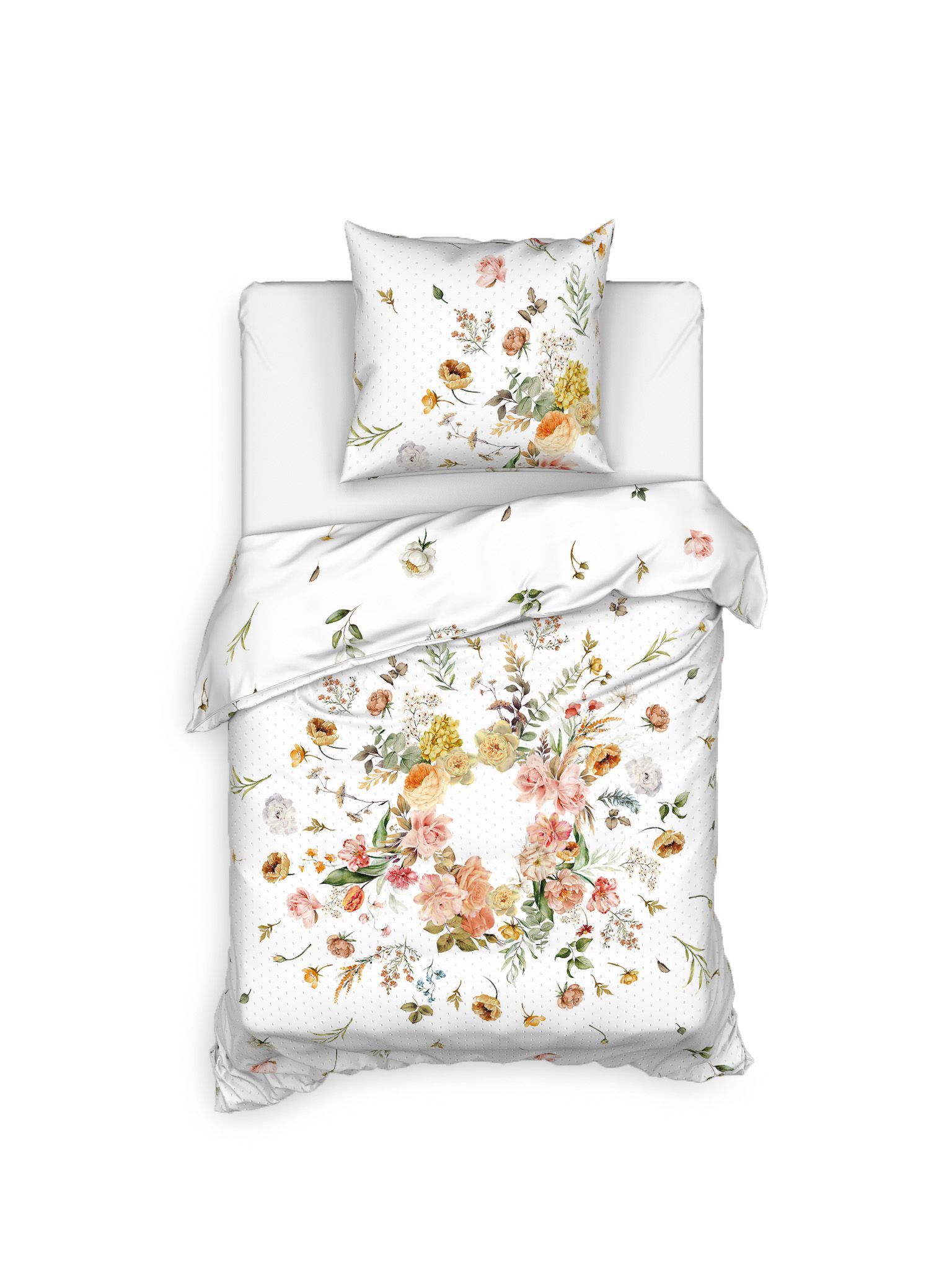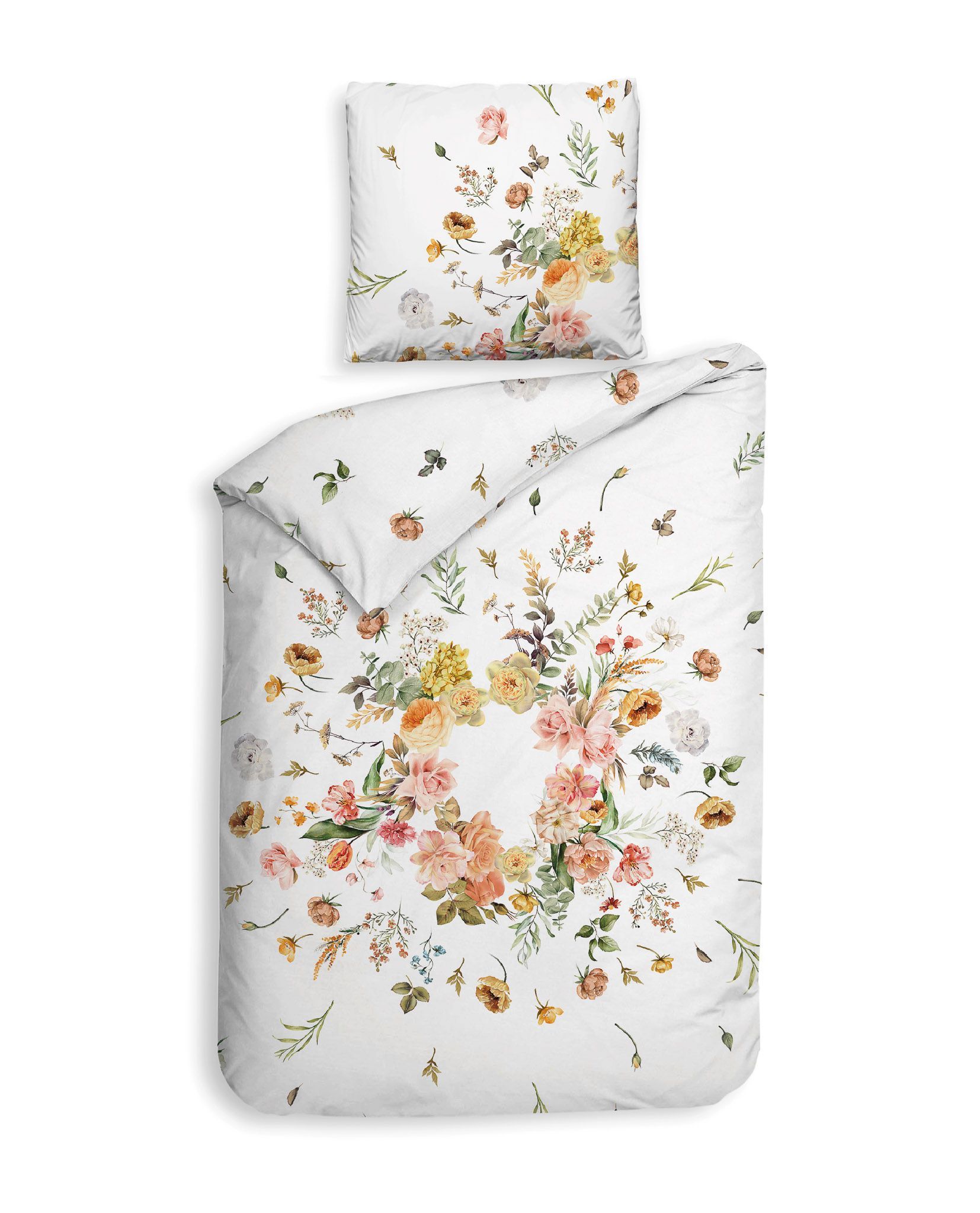 Heckett & Lane Mako-Satin Bettwäsche 155x220 Tuva White Blütenkranz koralle weiß
